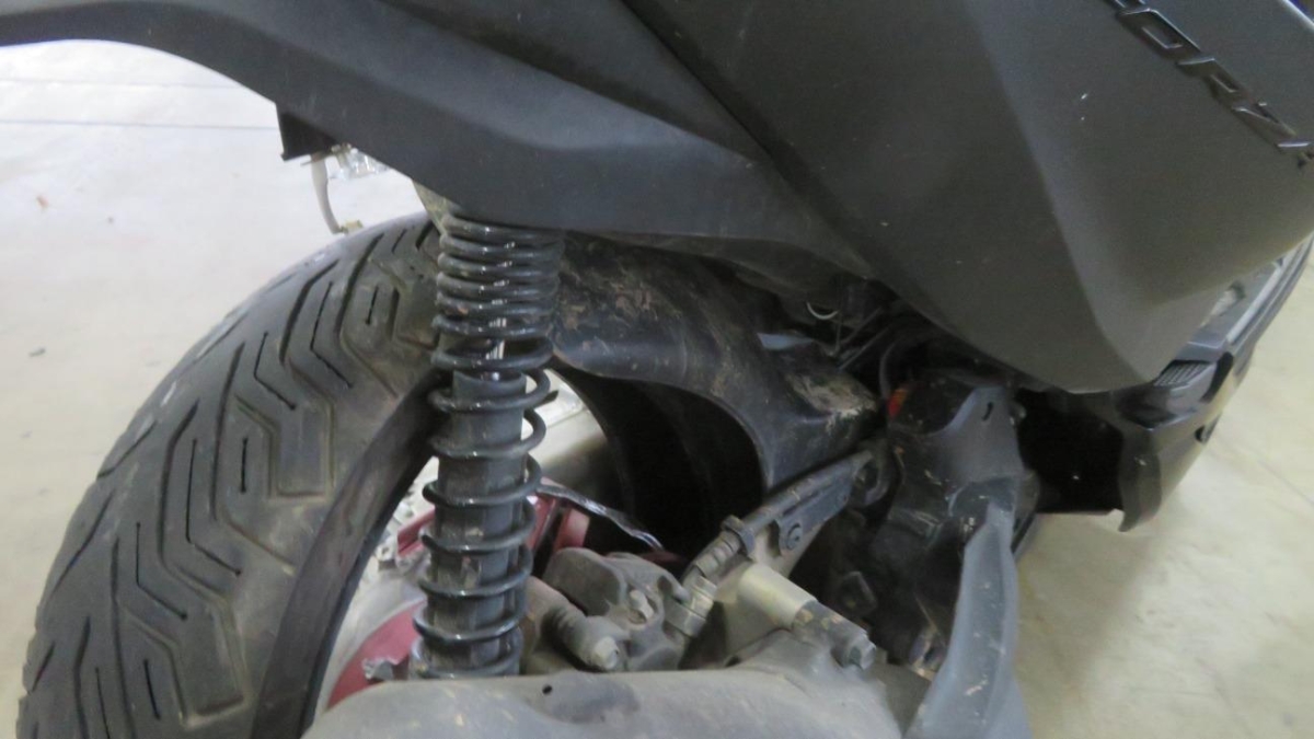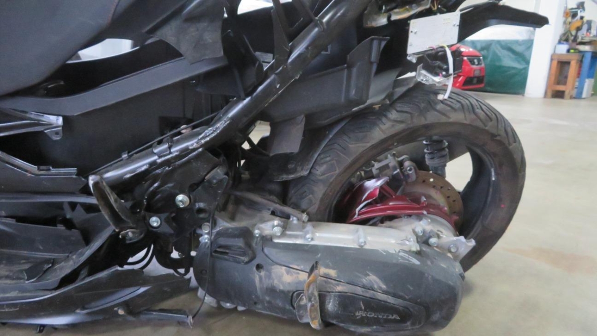 Antrieb, Heck, Motor, Rad hinten, Rahmen, Rücklicht, Rücklicht links, Rücklicht rechts, Schwinge, Sitz, Verschalungen links