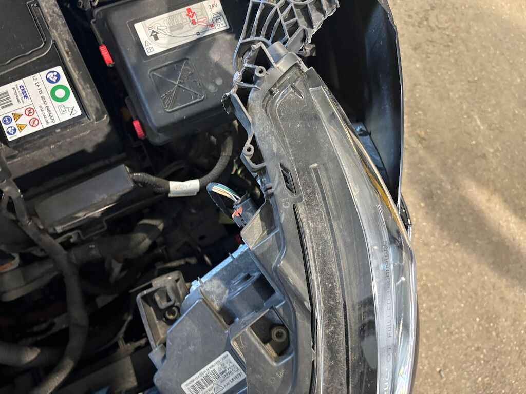 Kollisionsschaden vl mit Beschädigung von Stosstange, Frontmaske, Scheinwerfer, Motorhaube, Kotflügel, Radhaufhängung, Felge, Türe vl, Lenkung Motor startet nicht, 12V Batterie entladen Motor Getriebe Vorderachse Hinterachse Airbags ausgelöst: 0 unbekannt ( Abfallcode 16.01.04ak )