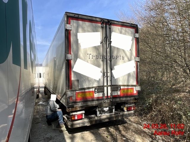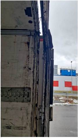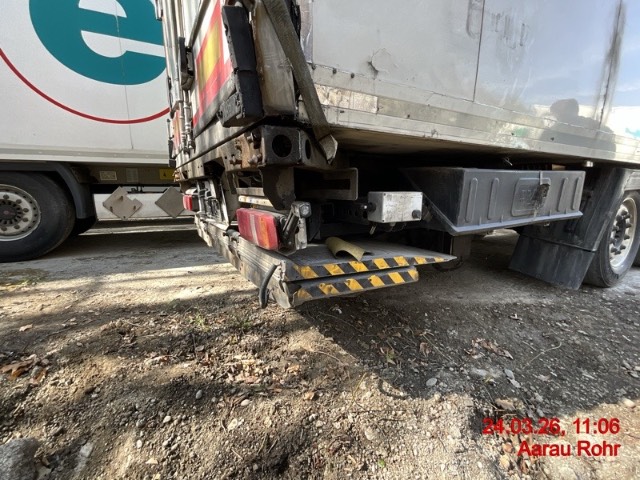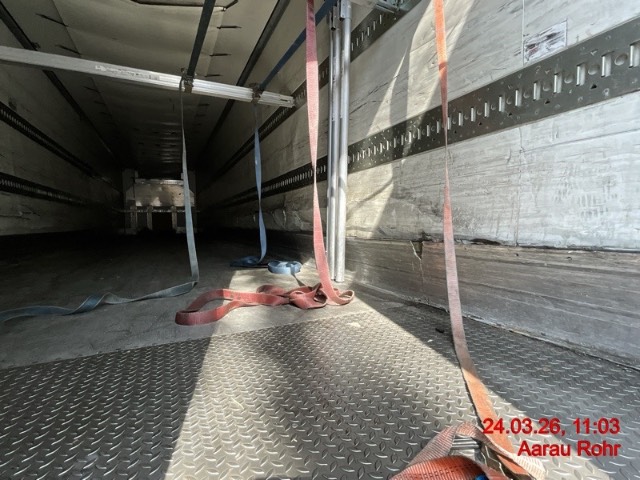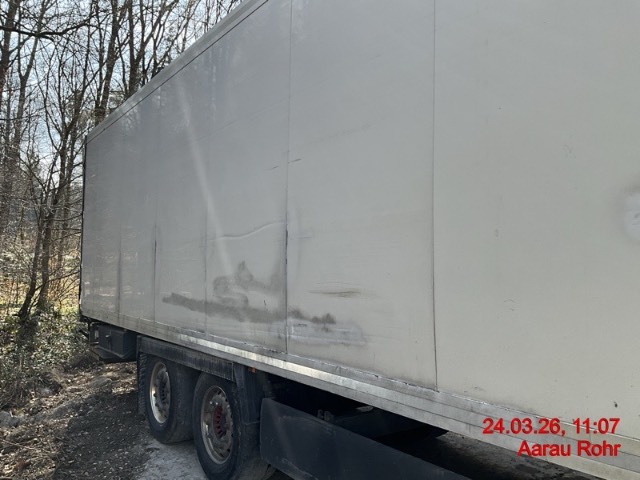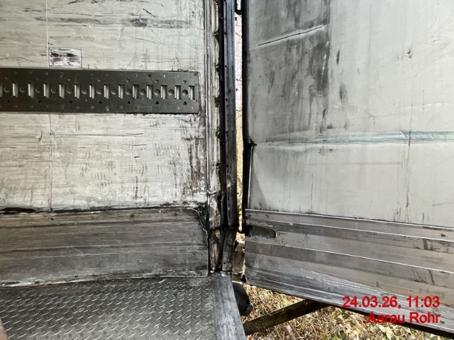 Heck: Portalrahmen ausgerissen, Flügeltüre rechts beschädigt. / Vorbestandene Schäden: Vorne rechts: Ecke eingedrückt und prov. repariert. Seite rechts: diverse Schäden an der ganzen Seitenwand innen und aussen. Seite links: diverse Schäden an der ganzen Seitenwand innen und aussen