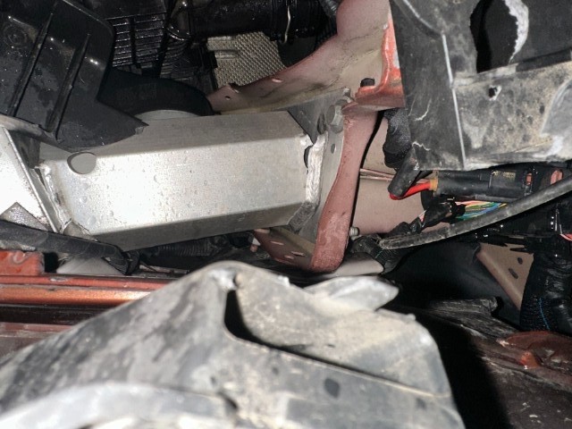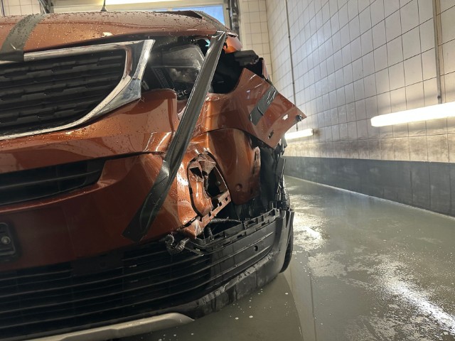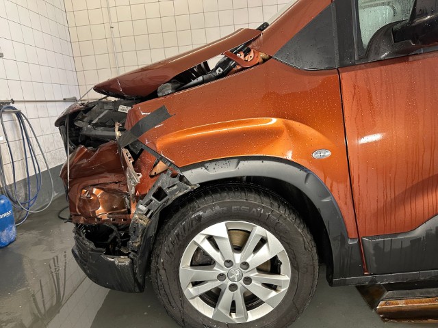 Front links eingedrückt. Frontblech/Maskenblech eingedrückt. Längsträger vorne links gestaucht. Fahrzeugvorbau verschoben.