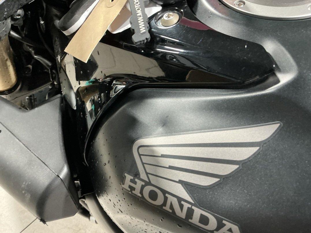 Choc côtés droit et gauche Jantes légèrement pliées, rayées Radiateur cassé Fourche et T de fourche sous réserve Carters, côtés droit et gauche, râpés Divers carénages cassés