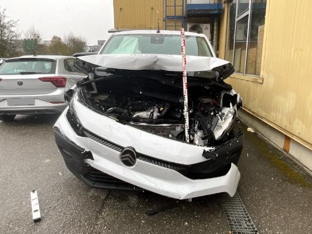 Front eingedrückt. Frontblech/Maskenblech eingedrückt. Längsträger vorne rechts und links gestaucht. Fahrzeugvorbau verschoben.