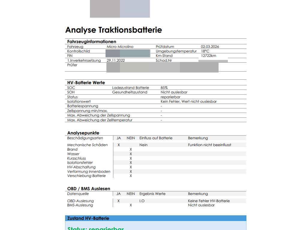 Die Hochvoltbatterie wurde geprüft und ist reparierbar. Das Fahrzeug wird mit der HVBatterie verkauft. Die HV-Batterie muss durch einen Fachbetrieb repariert werden (neuer Batteriedeckel, Unterboden Batterie instand stellen)Die (vom Fahrzeugexperten) ermittelten Reparaturkosten beziehen sich auf das versicherte Ereignis. Allfällige zusätzliche, nicht versicherte Schäden/Vorschäden, sind in den Reparaturkosten nicht enthalten. Die deklarierten Ausstattungsmerkmale können von der effektiven Ausstattung abweichen.AchtungBei einem Hochvoltsystem - Spannungsfreiheit prüfen. Sicherheitshinweise und Betriebsanleitungen des Herstellers konsultieren und befolgen.