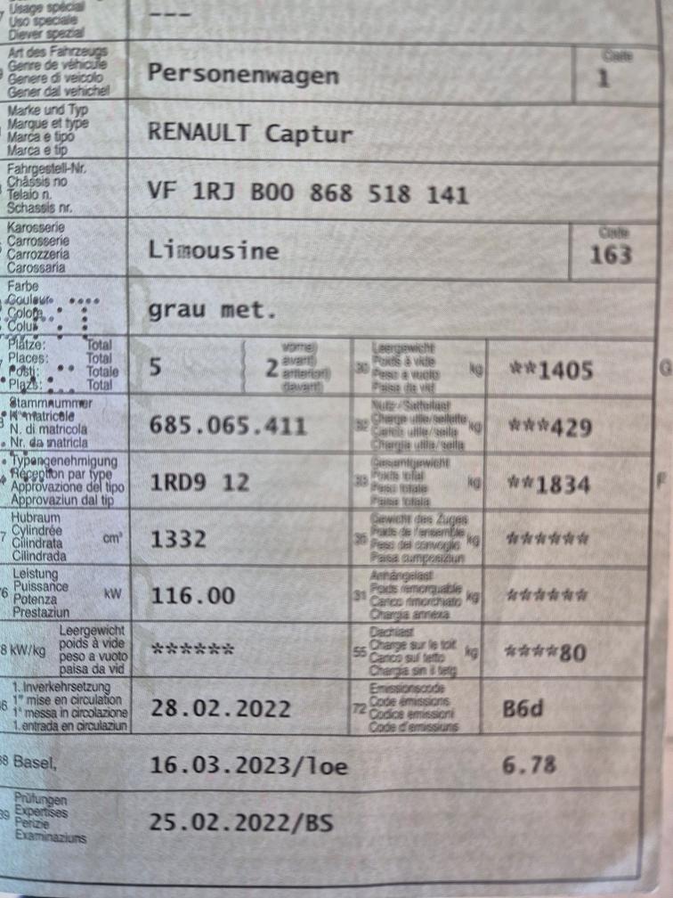 Captur 1.3 TCe 160 R.S. Line EDC / Pack Winter / Pack Parking / Pack Conduite Autonome / Pack Infotainment // Am Fahrzeug wurde kein Werkstatttest gemacht (Für sichtbare oder nicht sichtbare Mängel wird nicht gehaftet). Wir testen & kontrollieren nicht alle Funktionen vom Fahrzeug. Das Risiko liegt somit vollumfänglich beim Käufer. Nachdem der Höchstbietende den Zuschlag erhalten hat, gibt es keine Nachverhandlung, auch wenn nicht deklarierte Mängel zum Vorschein kommen sollten. Ab Platz ohne Garantie, Wandelung und Minderung werden wegbedungen. Abholung nach Zuschlag innert 5 Tagen. Das Fahrzeug kann vorgängig am Steinackerweg 12 in 4322 Mumpf besichtigt werden.