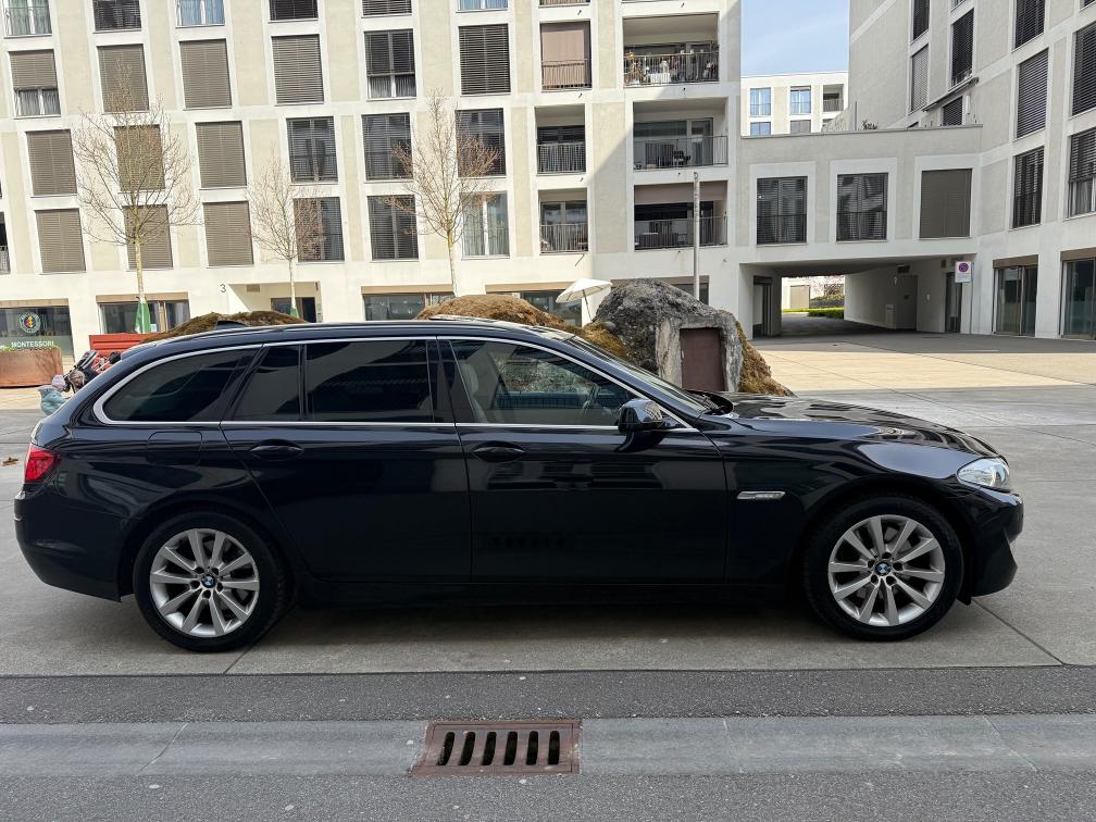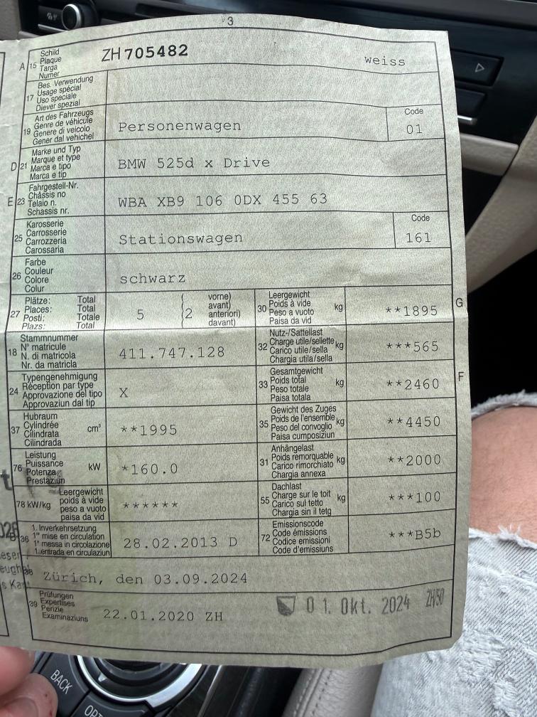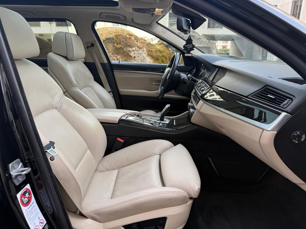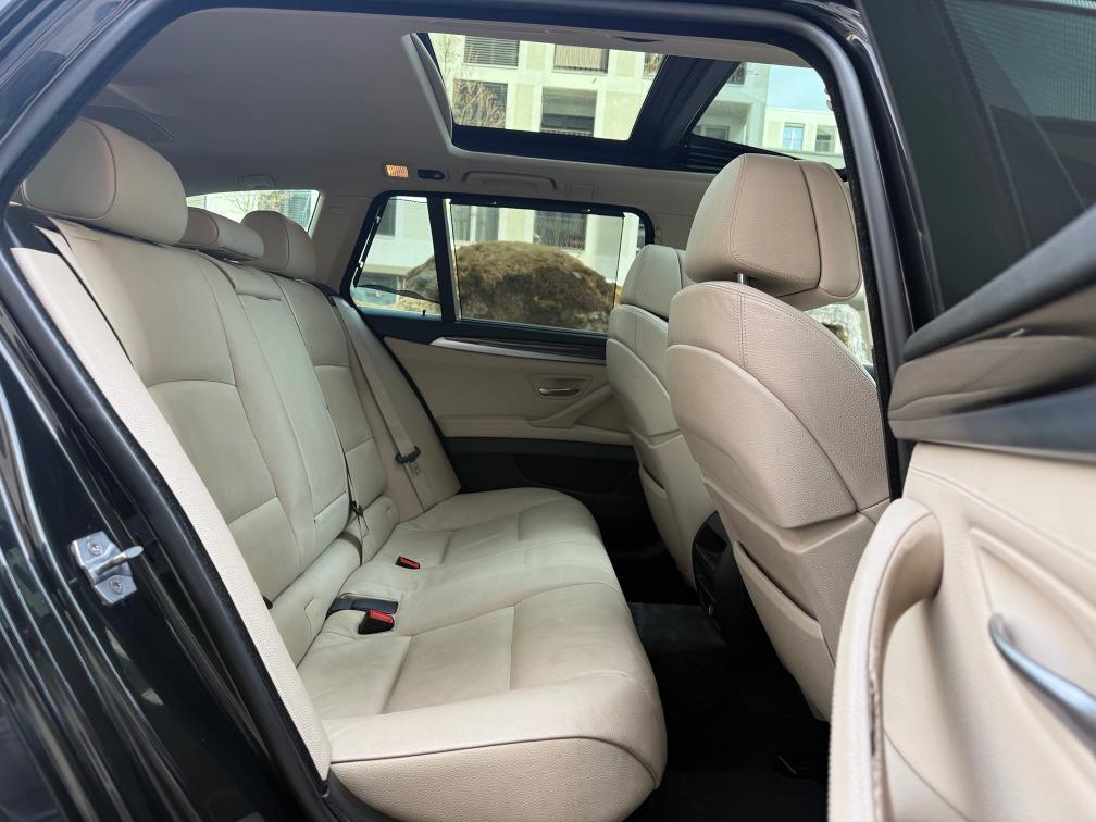 Fahrzeugdaten: • Modell: BMW 525d xDrive Touring • Motor: 2.0 Diesel (1995 cm³) • Leistung: 160 kW / 218 PS • Antrieb: Allrad (xDrive) • Getriebe: Automatik • Erstzulassung: 28.02.2013 • Sitzplätze: 5 • Farbe: Schwarz • Emissionscode: B5b ⸻ Ausstattungshighlights: • Panorama-Schiebedach • Lederausstattung beige • Elektrische Sitze mit Memory • Navigationssystem Professional • Rückfahrkamera + Parksensoren • Tempomat mit Limiter • Multifunktionslenkrad • Klimaautomatik • Bluetooth / Media • xDrive Allradantrieb (perfekt für CH-Verhältnisse) • ISOFIX ⸻ 🧼 Zustand: • Fahrzeug ist gepflegt und sauber • Innenraum in gutem Zustand (normale Gebrauchsspuren vorhanden) • Technisch einwandfrei