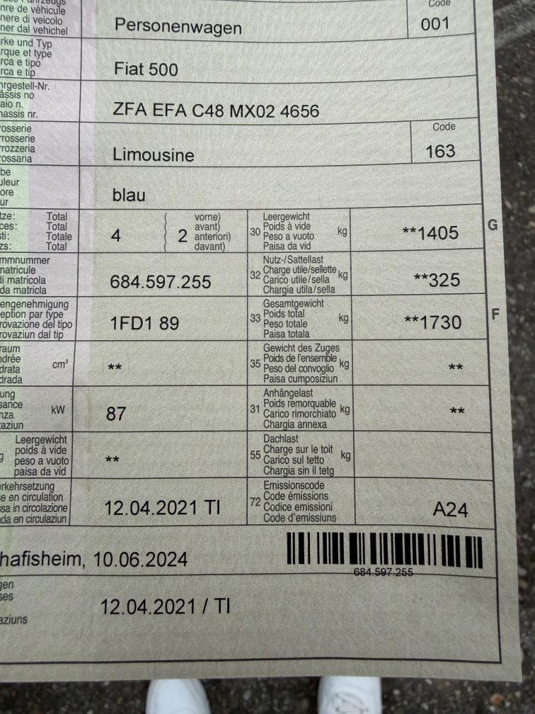 Sehr gepflegtes Fahrzeug, Bild Nummer 2 und 3 mit den Sommerräder. Dise wurden nicht Live gesehen, haben jedoch gemäss Kunde keine Beschädigungen. Winterreifen erst ca. 500km alt. Batterie hat noch die originale Garantie von Fiat. Am Fahrzeug sind keine Mängel bekannt, Bilder so gut wie möglich gemacht. Kundenvorstellung liegt bei mind. 13'000.-, darunter wird es keinen Zuschlag geben. Kein Werkstatttest durchgeführt. Am Fahrzeug wurde kein Werkstatttest gemacht (Für sichtbare oder nicht sichtbare Mängel wird nicht gehaftet). Wir testen & kontrollieren nicht alle Funktionen vom Fahrzeug. Das Risiko liegt somit vollumfänglich beim Käufer. Um Missverständnisse zu vermeiden kann das Fahrzeug auf Voranmeldung besichtigt & getestet werden, sollten Sie davon bewusst kein Gebrauch machen dann liegt die Verantwortung bei Ihnen. Nachdem der Höchstbietende den Zuschlag erhalten hat, gibt es keine Nachverhandlung, auch wenn nicht deklarierte Mängel zum Vorschein kommen sollten. Ab Platz ohne Garantie, Wandelung und Minderung werden wegbedungen.