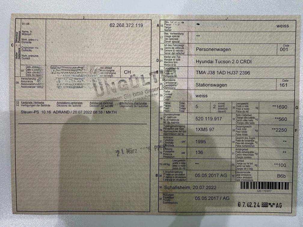 Sehr gepflegter TUCSON aus 1. Hand in technisch und optisch sehr gutem Zustand 8-fach bereift auf Alufelgen Alle Service lückenlos gemacht Dieselpartikelfilterfilter DPF in Ordnung Pure DAB+ Empfänger eingebaut Direktimportfahrzeug fehlende Optionen gegenüber CH-Fahrzeug: ACC, Totwinkelwarner, elektrische Heckklappe 1 RDKS Sensor an einem Winterrad ist defekt Heckverkleidung rechts unten leicht angefahren (siehe Foto)