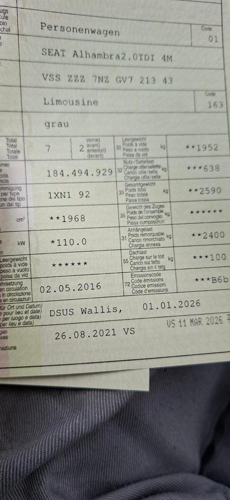 Frisch ab MFK Gepflegter Seat Alhambra mit 7 Sitzen in einem schönen Grau Winterreifen sind komplett abgefahren Elektrische Schiebetüren u. Heckklappe Es wurde kein Werkstatttest durchgeführt, da das Auto eben erst vorgeführt wurde.