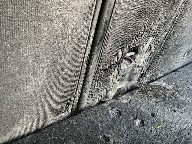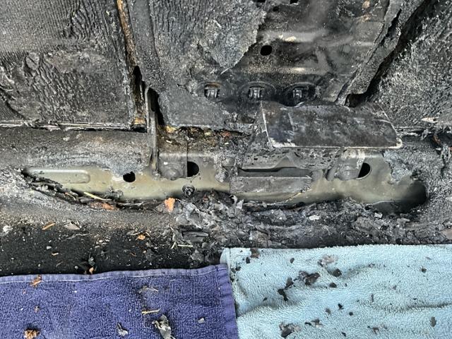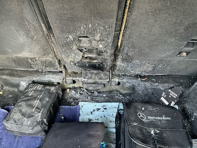 Fahrzeug weist im Innenraum Brandspuren auf.
