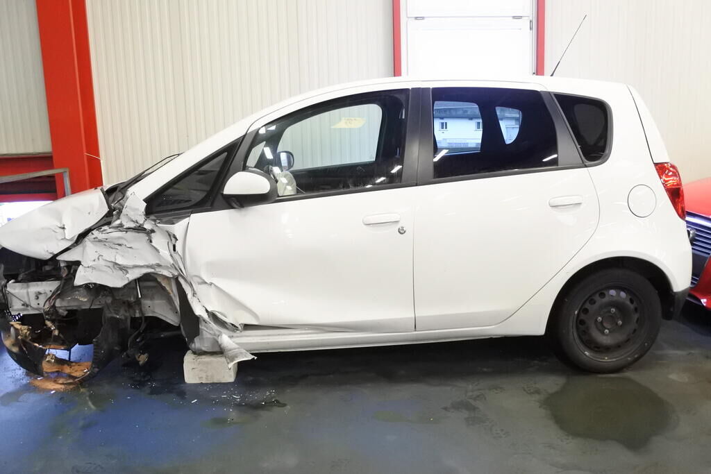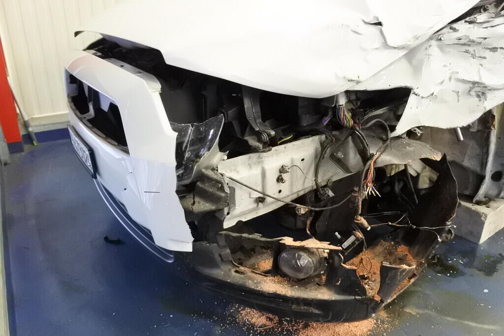 Die Stossstange mit Anbauteilen, Befestigungen, die Quertraverse, der Scheinwerfer, die Motorhaube, der Schlossträger, der Kotflügel mit Aufnahme, Radhausschale, das Radhaus, das Scheibenrad mit Aufhängung und Lenkung, die Fahrertür sowie der Schweller sind beschädigt. Beide Frontairbags und die Gurtenstraffer vorne wurde ausgelöst.Das Armaturenbrett und die Frontscheibe sind zerstört. Weitere Schäden gehen aus den Fotos hervor. Motor Getriebe Vorderachse Hinterachse Airbags ausgelöst: 2 unbekannt ( Abfallcode 16.01.04ak )