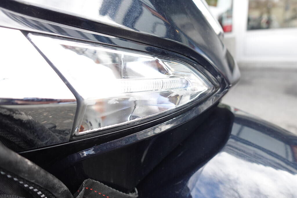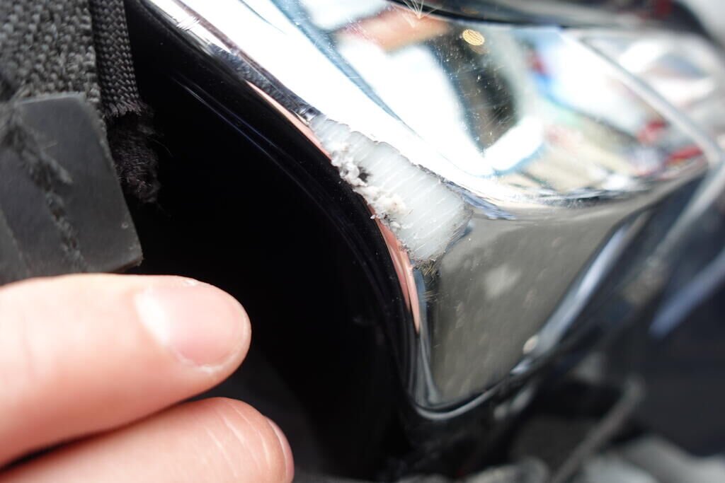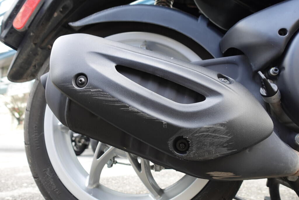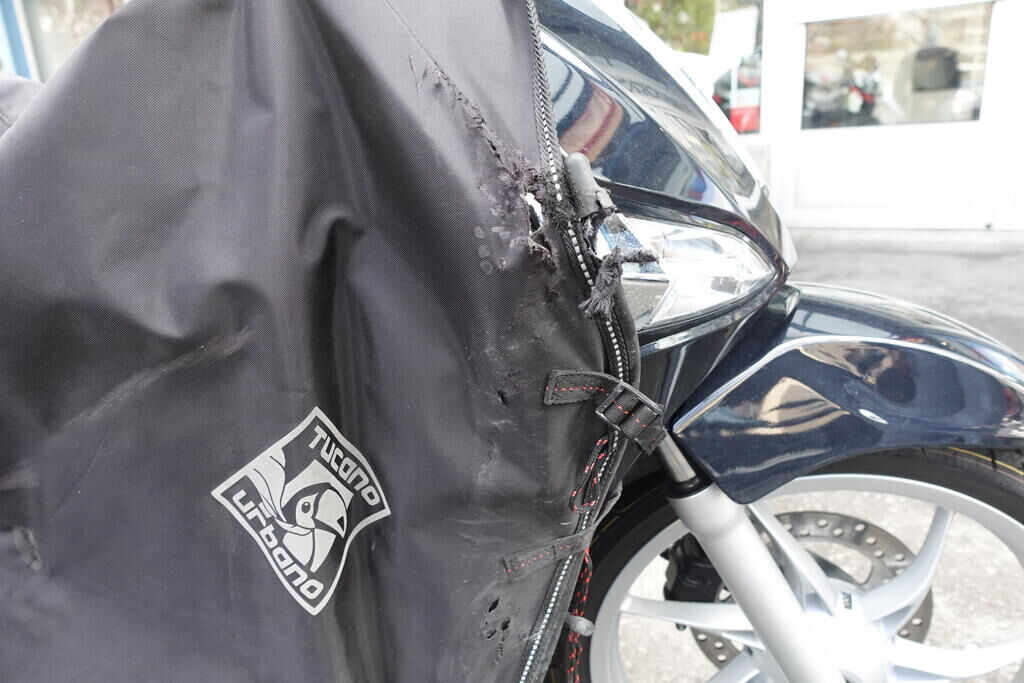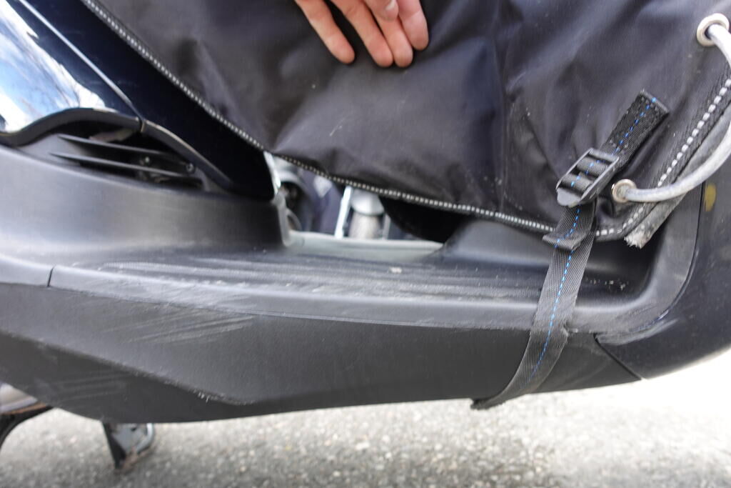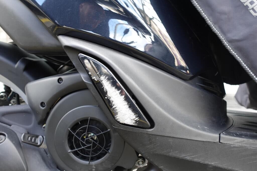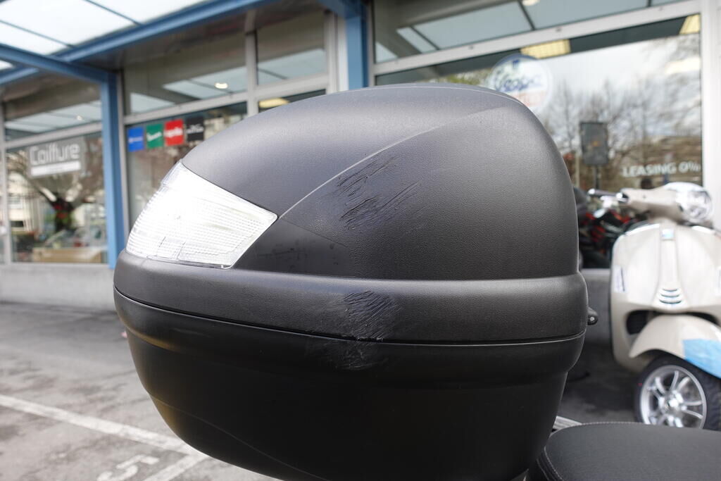 Choc latéral droit: Top case, cale-pied passager, protection thermique échappement, échappement, rétroviseur, levier frein avant, couverture thermique, tablier, carénage latéral avant, bas de caisse, plancher, clignotant avant, pare-boue avant, jante et pneu avant; endommagés. Motor Getriebe Vorderachse Hinterachse Airbags ausgelöst: 0 unbekannt ( Abfallcode 16.01.04ak )