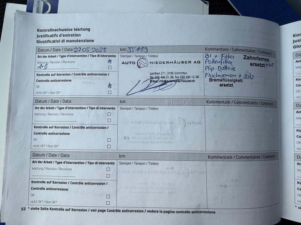 Fahrzeug ist aussen und innen in einem sehr guten Zustand, alle Service wurden immer in einer Dacia Garage gemacht. Letzte Prüfung 11.2025. Zahnriemen wurde im Mai 2025 bei 33119 km ersetzt inkl. Wasserpumpe und Flachriemensatz. Sommer und Winterräder mit Alufelgen. Winterreifen wurden im Nov. 2025 ersetzt. BEIM SCHALTEN MIT DEM AUTOMAT VOM 3. IN DEN 4. GANG BEIM BESCHLEUNIGEN SIT EINBE FIBRATION SPÜHRBAR. IST SCHWIERIG FESTZUSTELLEN VON WO ES KOMMT. ABER DAS FAHRZEUG IST SONST GUT FAHRBAR UND SCHLATET AUCH GUT!!
