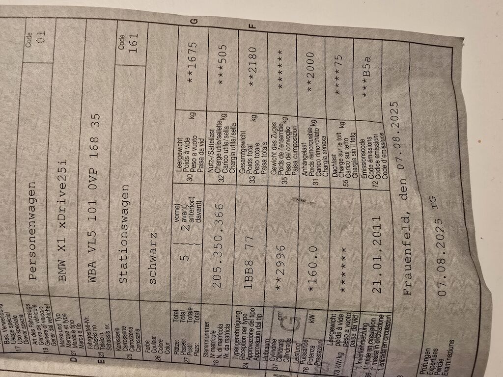1. Inverkehersetzung 21.01.2011 Letzte MFK 07.08.2025 Fahrzeug ist fahrbar. Verkauf ab sofort. Schadenbeschrieb Keine technische Prüfung (Werkstatttest) vorgenommen. Motor Getriebe Vorderachse Hinterachse Airbags ausgelöst: 0 unbekannt ( Abfallcode 16.01.04ak )
