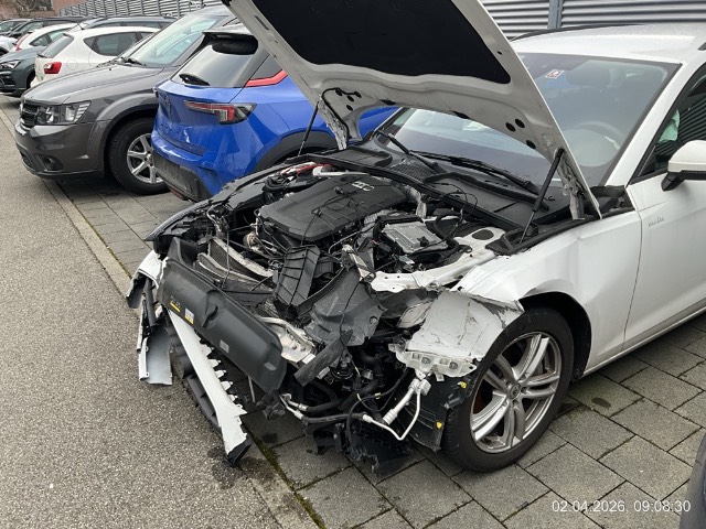 Beschreibung der Schäden: Front-, Seitem-und Heckschaden: Front Mitte/links stark eingedrückt und nach rechts gestaucht. Stosstange, Träger, Schlossträger, Kotflügel Scheinwerfer, alle Kühler eingedrückt. Risiko Aufhängung vorne links Heck: Stossstange, Heckklappe, Heckblech und Seitenwand hinten rechts stark eingedrückt. Risiko Aufhängung hinten rechts Risiko Motor und Anbauteile, Motor läuft nicht (Sicherheitsabschaltung). Fahrer-, Beifahrer- und beide Kopfairbags ausgelöst, alle Gurtstraffer ausgelöst.