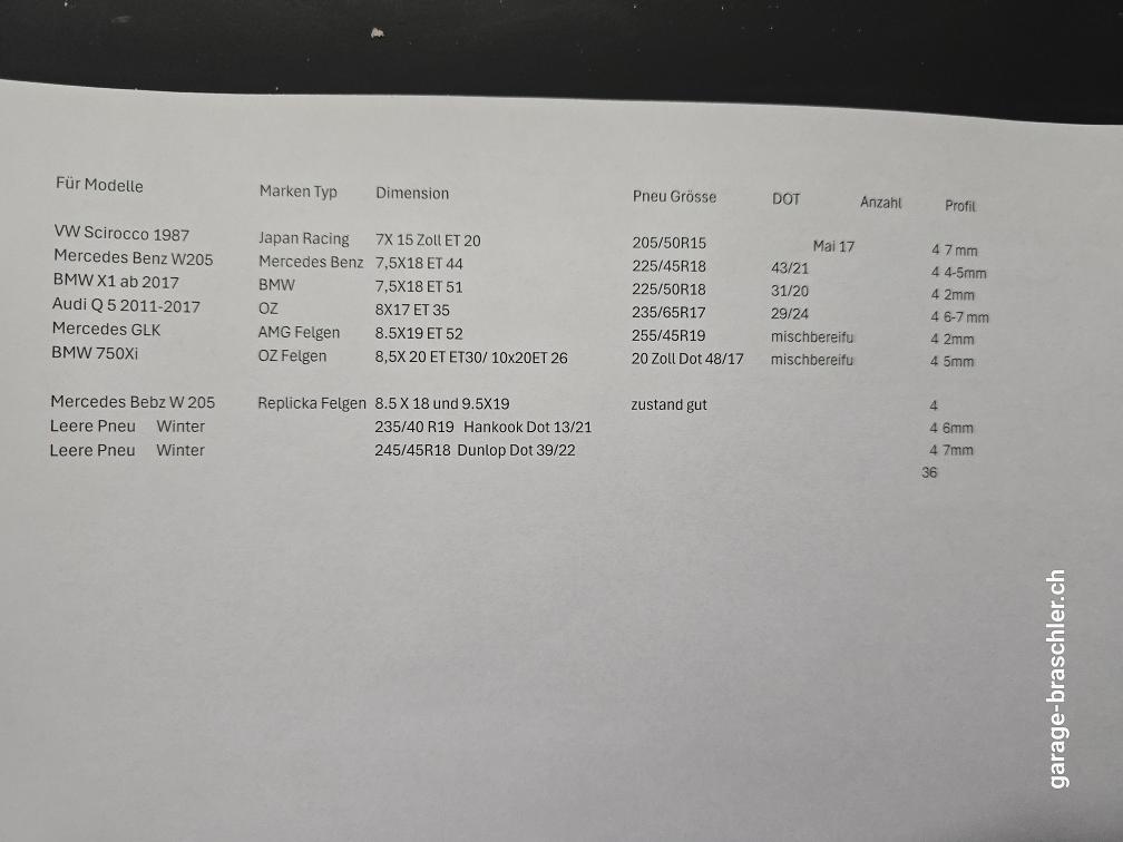 Nur Felgen zu Verkaufen -OZ-Felgen Für 750 XI 8.5 X 20 ET 30 und 10X 20 ET 26 Mit Eigenerklärung -BMW X 1 Felgen Original BMW 18 Zoll Pneu Flach -Mercedes Benz W 205 Allrad 18 Zoll Winterräder -Audi Q 5 ab 2011-2017 17 Zoll OZ-Felgen mit Winterpneu Profil 6-7mm -VW Scirocco 1987 Japan Racing Felgen mit 205 Pneu -Mercedes GLK AMG Original Felgen Pneu flach -Mercedes Benz W 205 AMG Replika Felgen 8.5 X 18 und 9.5X19 in schwarz keine Reifendrucksensoren -Leere Pneu ohne Felgen -235/40R 19 Hankook Winterpneu 6 mm Dot 13/21 -245/45R 18 Dunlop Winterpneu Dot 39/22 Für weiter infos könnt ihr uns gerne kontaktiert werden Abholung muss nach innert 3 tage abgeholt werden