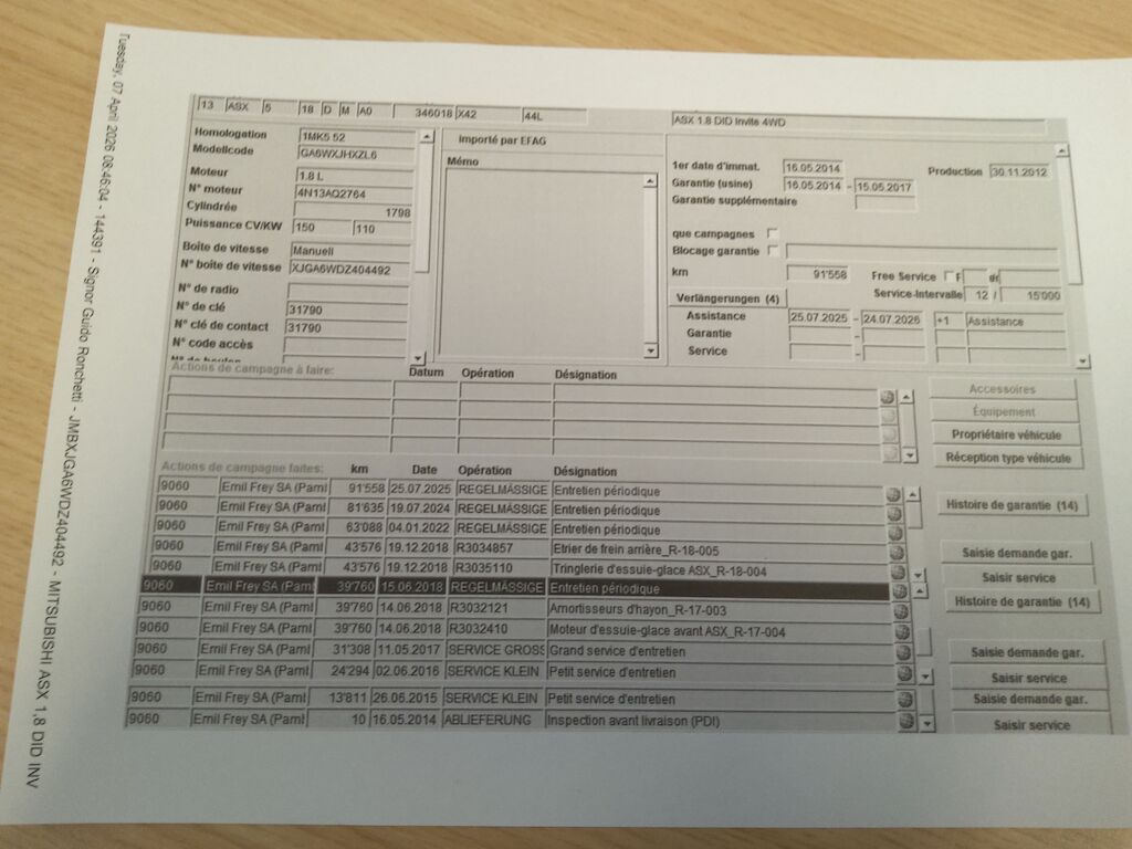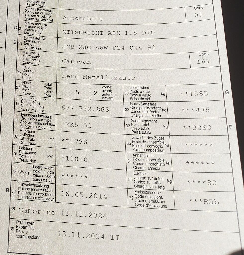 Non è stata effettuata alcuna ispezione tecnica (prova in officina) Filtro FAP non controllato Cofano motore leggermente rigato Piccoli danni di usura alla carrozzeria Calotta specchio SX rigata Bollo porta posteriore SX Danno paraurti posteriore Vernice opaca tetto DX Motor Getriebe Vorderachse Hinterachse Airbags ausgelöst: 0 Nein ( Abfallcode 16.01.04ak )