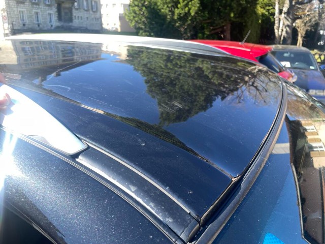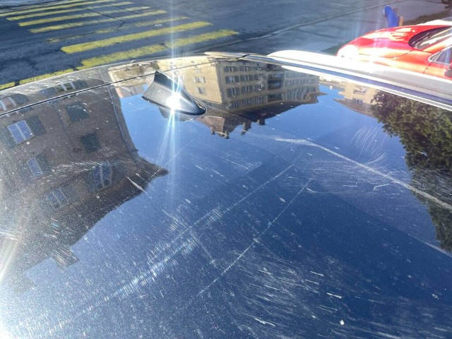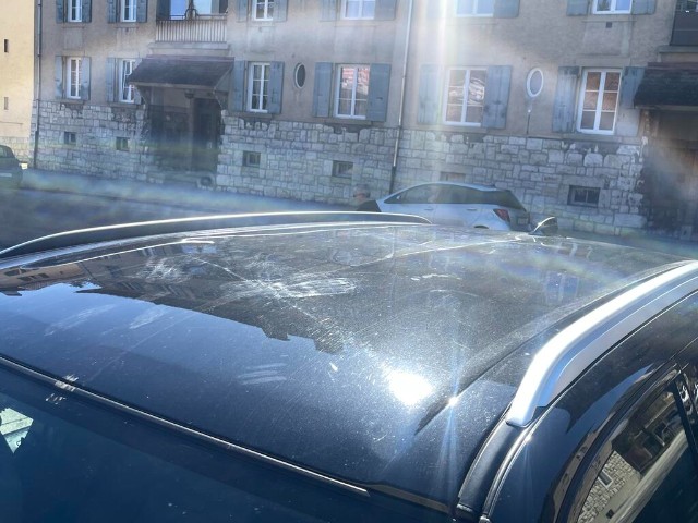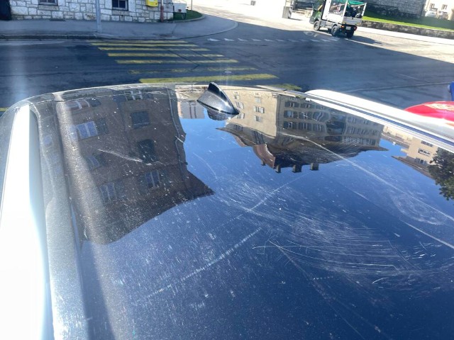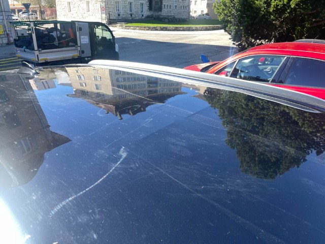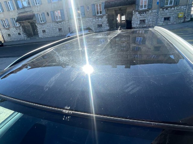 Dach und Motorhaube sind beschädigt. Frontscheibe beschädigt.