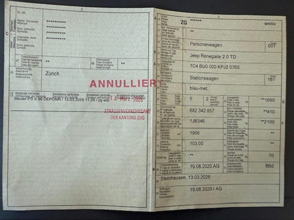CH-Auslieferung, lückenloser Servicenachweis (letzter 11.2025 bei Km 106'990, Sommerräder OHNE Reifen (19"), kleinere Kratzer, Schaden vo. re., Zubehör: Pack Function (Rücksitzlehne umklappbar im Verhältnis 40/20/40, Aussenspiegel elektrisch verstell-, anklappbar und beheizt, Fensterheber vorne elektrisch mit One-Touch-Funktion für Fahrer und Beifahrer, Keyless Enterering, Kofferraum-Ladeboden umkehrbarer und höhenverstellbarer), Pack Parking (Assist: Totwinkel-Assistent (Blind Spot Monitoring) inkl. hinterer Bewegungserkennung (Rear Cross-Path Detection), Assist: Parklenkassistent, Assist: Park-View Rückfahrkamera mit dynamischen Führungslinien), Paket: Swiss Pack (Polster: Ledersitze, Lenkrad: Lenkrad beheizbar, Gummifussmatten vorne und hinten, Licht: Fahrlichtschaltung automatisch (Lichtsensor) mit coming home / leaving home-Funktion, Scheibenwischer mit Regensensoren, Sitze: Vordersitze heizbar, Innenspiegel automatisch abblendbar, Licht: SmartBeam Fernlichtassistent, Scheibenwischer-Enteiser), Räder: 19" Aluminiumfelgen LIMITED, Media: Uconnect Multimedia: 8,4'' inkl. Navigation, Apple CarPlay und Android Auto, Lackierung: Metallic-Lackierung, Sitze: Vordersitze elektrisch verstellbar 8-fach, MySky Dach, adaptiver Tempomat usw.