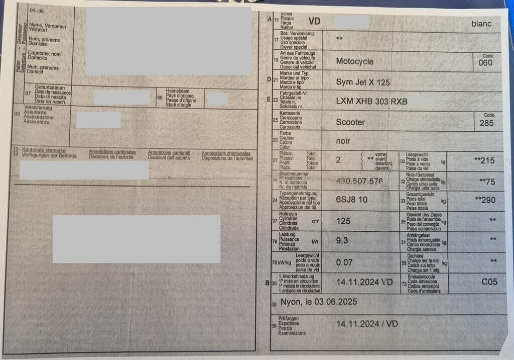 Chocs arrière et latéral gauche : Arrière : pare-boue, échappement, cadre. Latéral gauche : boîte à air, carénages, poignée passager, repose-pied passager, béquilles, rétroviseur, levier de frein, guidon et embout, pare-boue avant. Réserve : transmission. Motor Getriebe Vorderachse Hinterachse Airbags ausgelöst: 0 Ja ( Abfallcode 16.01.04ak )