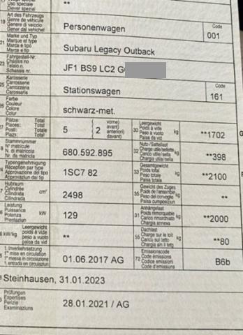 Airbag Fahrer und Beifahrerseite Sitzheizung vorne Fahrersitz elektrisch verstellbar Beifahrersitz elektrisch verstellbar Elektrische Fensterheber vorne + hinten Tempomat Leichtmetallfelgen Dachreling Seitenairbag Fahrer und Beifahrerseite Zentralverriegelung mit Fernbedienung Glasschiebedach elektrisch Lederlenkrad Kopfairbag vorne und hinten Reifendruck-Kontrollsystem RDK Lendenwirbelstütze Fahrersitz Lederschaltknauf Aussenspiegel elektrisch verstellbar/ heizbar und anklappbar Fahrersitz mit Memory Rücksitze geteilt umklappbar 60/40 Isofix-Kindersitzbefestigung ABS und EBV Elektr. Bremskraftverteilung inkl. BA Servolenkung elektrisch Rückfahrkamera Elektronische Fahrdynamik-Regelung Regen- und Lichtsensor Knieairbag Fahrer Keyless Schliess- und Startsystem Frontspoiler mit integrierten Nebellampen Heckklappe elektrisch Radio/ CD/ MP3/ DAB Touchscreen-Bildschirm Anschluss USB und AUX Fernbedienung am Lenkrad Stop + Start System LED-Scheinwerfer Abgedunkelte Scheiben Bluetooth Freisprechanlage mit Spracherkennung Keine Gewähr auf die Angaben der Serienausstattungen Klimaanlage automatisch 2-Zonen Navigationssystem DAB+ Pack Advanced Safety Pack Fahrerassistenz Eyesight