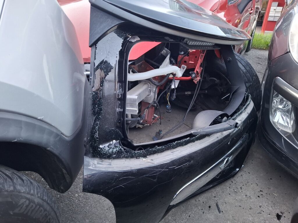 Dommage partie frontale: bloc avant fortement plié déformé embouti enfoncé disloqué endommagé, capot moteur tôle frontale renfort de pare chocs longerons gauche et droit joue d'aile gauche et droite fortement pliés déformés emboutis enfoncés endommagés, phare gauche et droit enveloppe supports garniture grilles de pare chcs convoyeurs d'air radiateurs calandre bouche d'aération de captot moteur ventilateurs de refroidissement cassés arrachés endommagés, condenseur de climatisation radiateur de refroidissement percés déformés endommagés, airbags conducteur passager et rideau droit déployés, ceintures de sécurité rétractées (réserve sur le moteur et la mécanique). Dommage arrière: panneau latéral gauche plié déformé embouti enfoncé, vitre de custode droite cassée explosée, hayon découpé plié, feux gauche et droit cassés, banquette arrière arrachée. Motor Getriebe Vorderachse Hinterachse Airbags ausgelöst: 3 unbekannt ( Abfallcode 16.01.04ak )