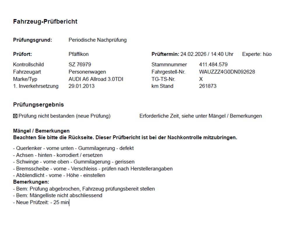 Prüfbericht bei Fotos angehängt. Am Fahrzeug wurde kein Werkstatttest gemacht (Für sichtbare oder nicht sichtbare Mängel wird nicht gehaftet). Wir testen & kontrollieren nicht alle Funktionen des Fahrzeugs. Das Risiko liegt somit vollumfänglich beim Käufer. Ab Platz ohne Garantie, Wandelung und Minderung werden wegbedungen.