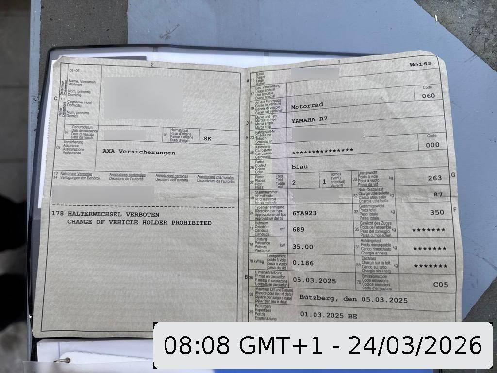 Motorrad hat anderen Endschalldämpfer mit Beiblatt (vorhanden) montiertDiverse Anbauteile nicht originalMotorrad ist auf 35 Kw gedrosseltDie (vom Fahrzeugexperten) ermittelten Reparaturkosten beziehen sich auf das versicherte Ereignis. Allfällige zusätzliche, nicht versicherte Schäden/Vorschäden, sind in den Reparaturkosten nicht enthalten. Die deklarierten Ausstattungsmerkmale können von der effektiven Ausstattung abweichen.AchtungBei einem Hochvoltsystem - Spannungsfreiheit prüfen. Sicherheitshinweise und Betriebsanleitungen des Herstellers konsultieren und befolgen.