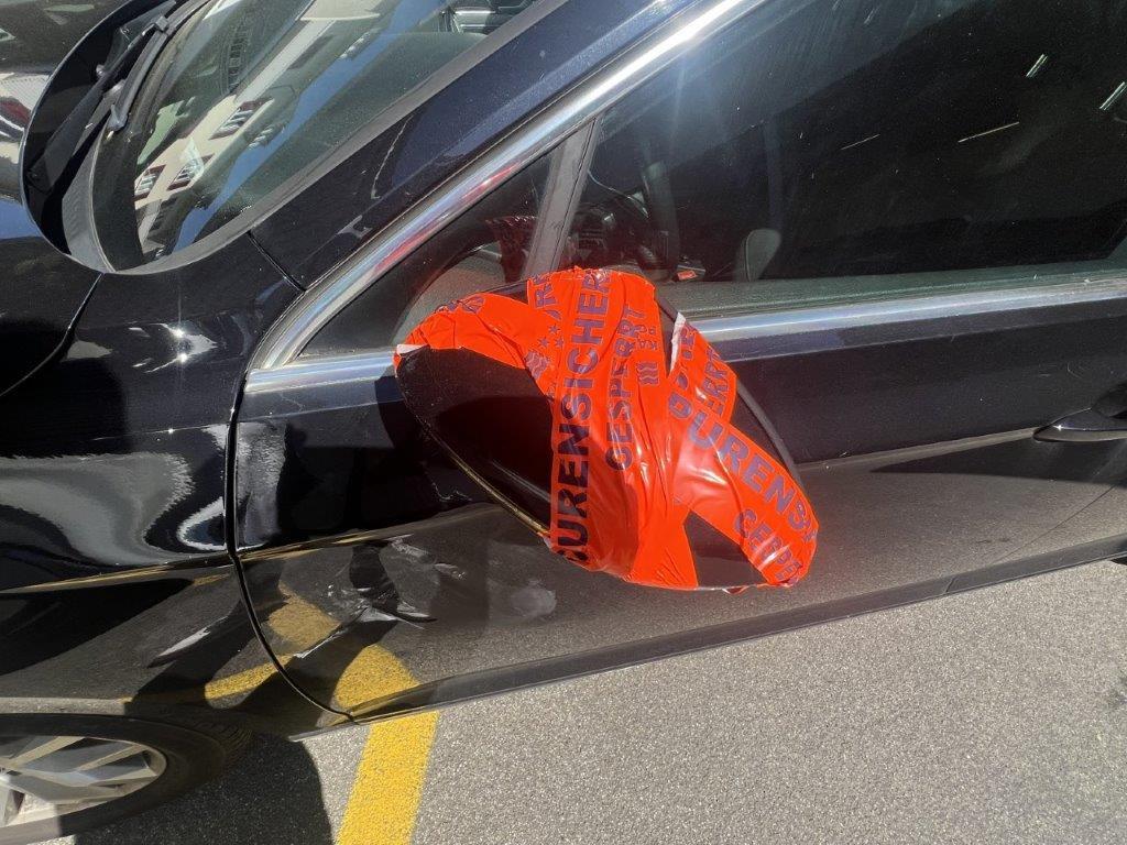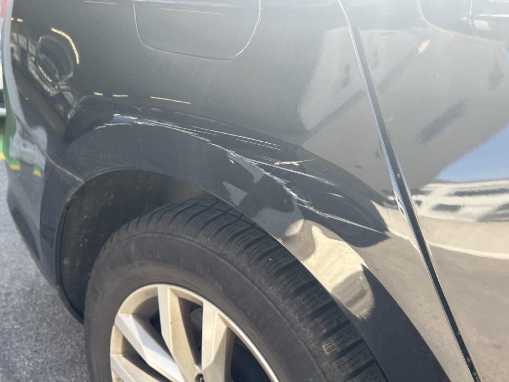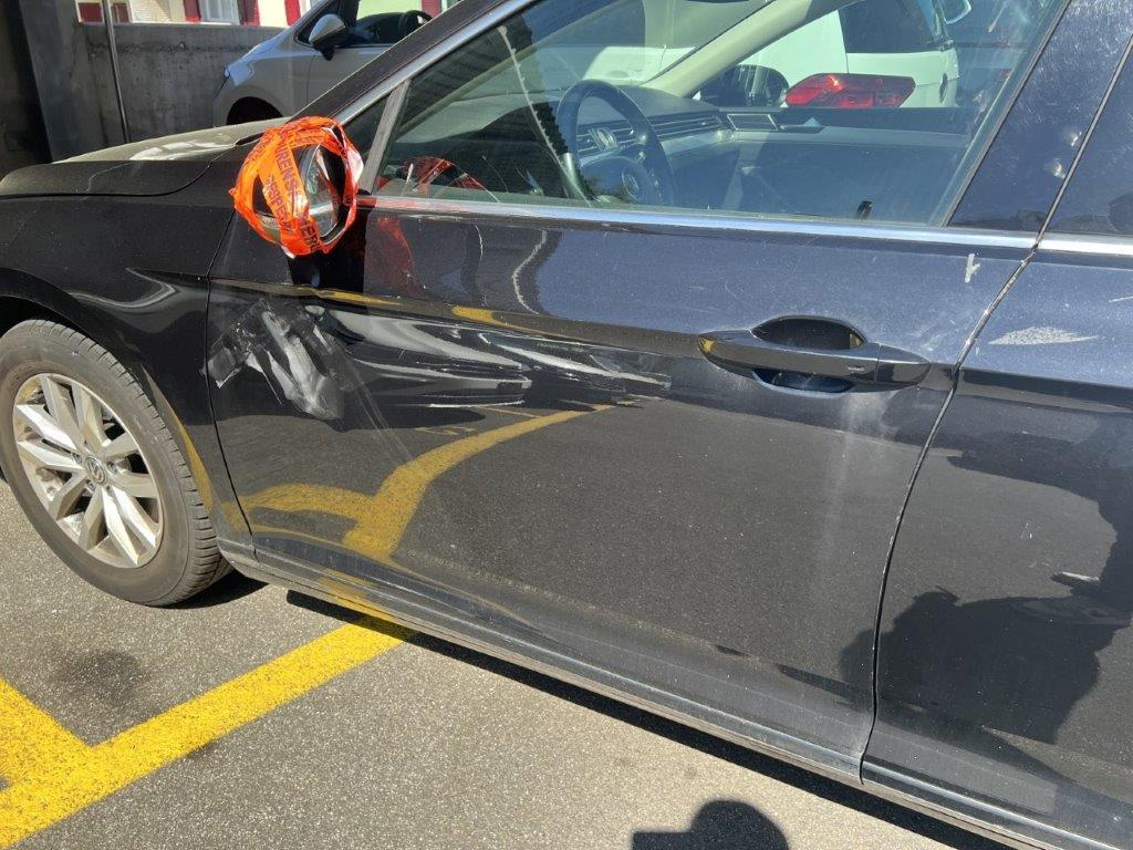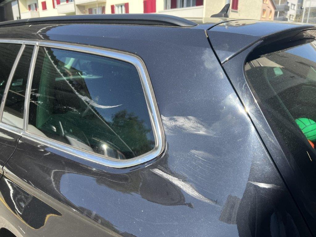 Anprall linke Seite: Dabei wurde die Stossstange hinten, die Seitenwand, beide Türen, der Rückspiegel und das hintere Seitenfenster beschädigt.