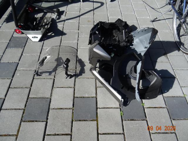 Fussraste hinten links, Bremshebel links, Aussenspiegel links, Scheinwerfer, Schinwerfer-Verschalung gerissen, Windscheibe zerkratzt
