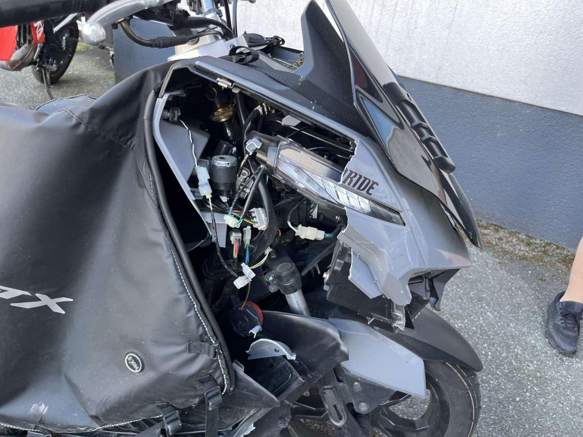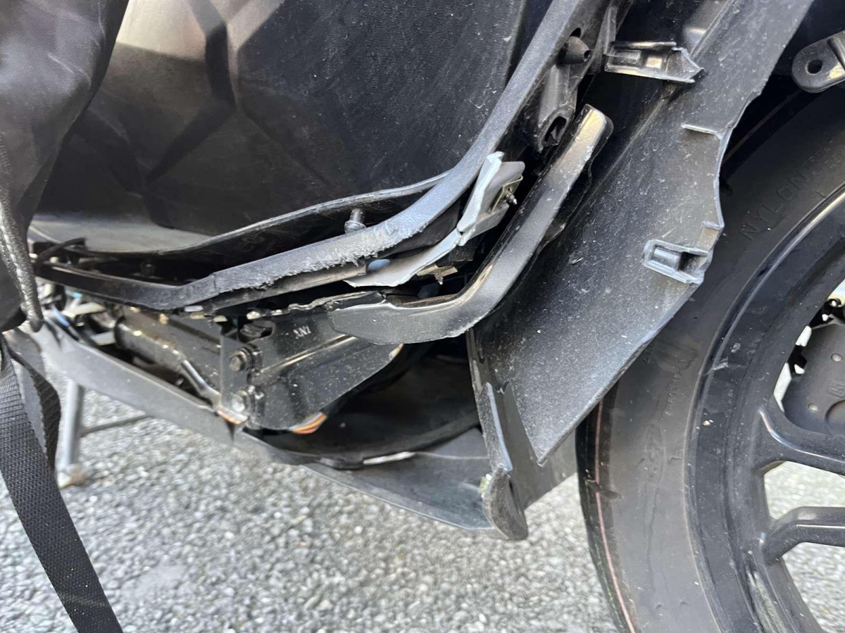 Choc avant droit : Face avant, tablier intérieur, phare avant, fourche, bas de caisse droit, repose pied, cadre, couverture, pare chaleur échappement endommagés et cassés.