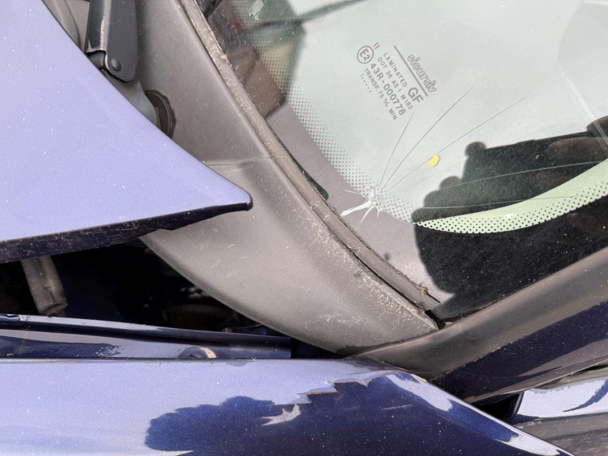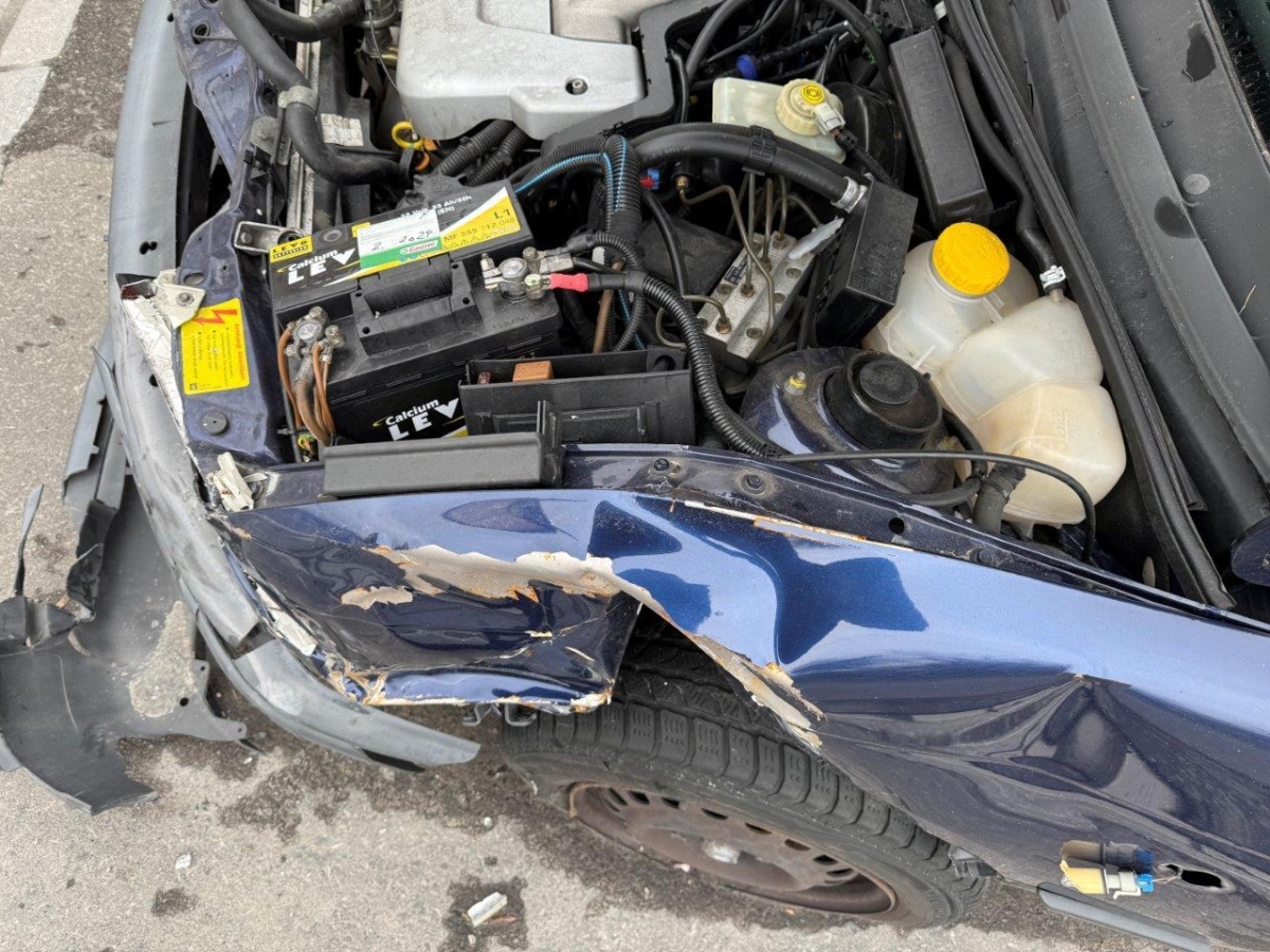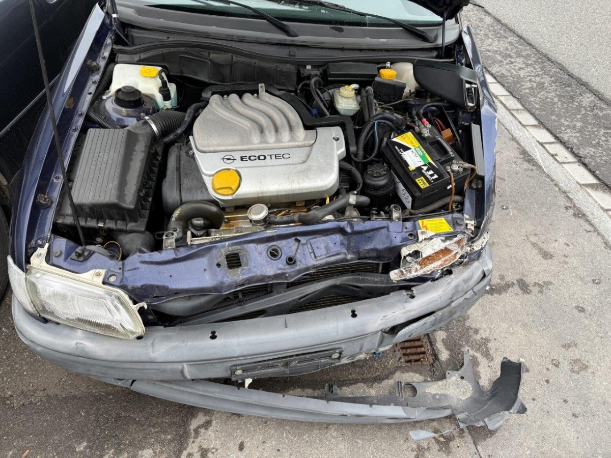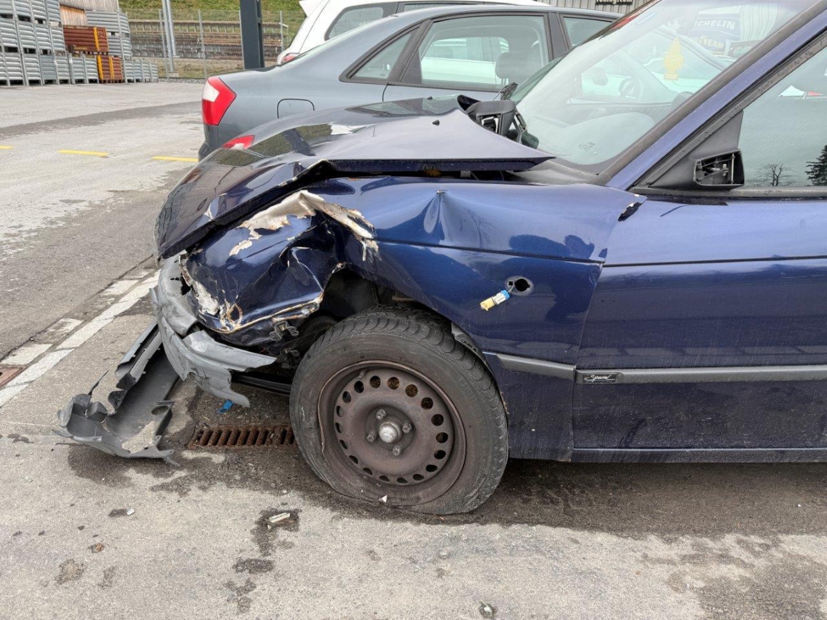 Anprall vorne links: Dabei wurde die Motorhaube mit Anbauteile, beide Scheinwerfer, beide Kotflügel, die Stossstange, der Kühlergrill, der Schlossträger, alle Kühler mit Lüfter und Lüfterzarge, das Radhaus, die Radaufhängung mit Lenkung, die Felge mit Reifen, beide Längsträger, sowie diverse Anbauteile beschädigt. Der Motor und die Front wurden nach rechts verschoben. Motor startet nicht, Ursache unbekannt.