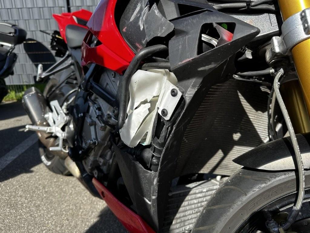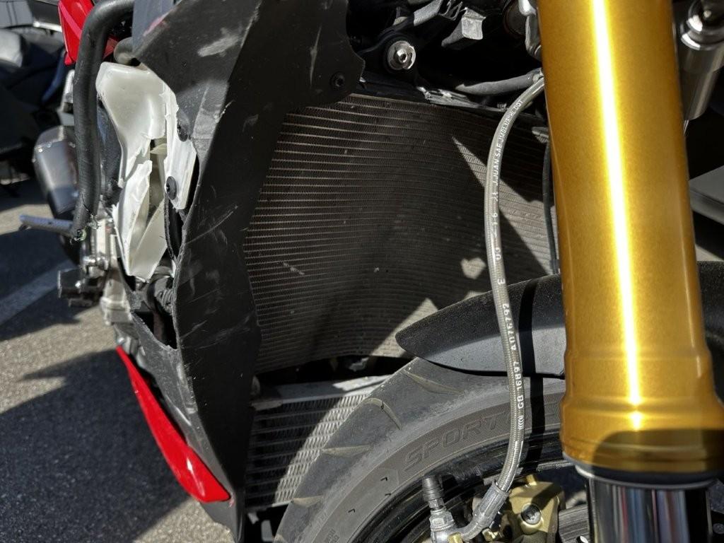 Anprall an der Fahrezugseite rechts : Dabei wurde die Seitenverkleidung, der Motor, der Zylinderkopf, der Gabelholm rechts,der Kühler sowie diverse Anbauteile deformiert sowie beschädigt. Der Motor konnte schadenbedingt nicht gestartet werden. Bitte beachten Sie Folgendes: Die originalen Spiegel werden montiert, die Orginale Blinker, die Handyhalterung wird entfernt und die Auspuffanlage wird wieder auf Originalzustand zurückgebaut. ACHTUNG: - Lediglich 1 Fahrzeugschlüssel vorhanden! - Diverse Vorschäden und Deformationen rundum!