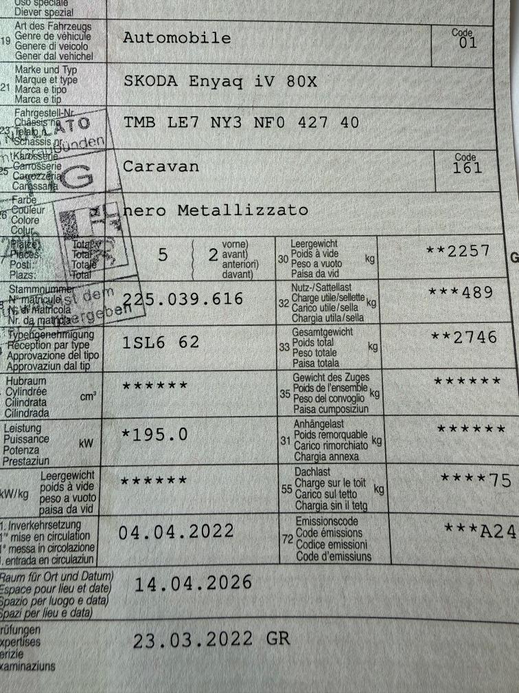Das Fahrzeug befindet sich in einem hervorragenden Zustand; es weist weder Karosserieschäden noch Dellen auf. Die beiden Felgen auf der linken Seite haben leichte Kratzer (siehe Fotos). Die Winterpneus verfügen über eine Profiltiefe von 6 mm vorne und 7 mm hinten. Die Batterie hat einen SOH-Wert (State of Health) von 90%. Zudem verfügt das Auto über eine Werksgarantie bis zum 03.04.2027 oder bis maximal 150'000 km.