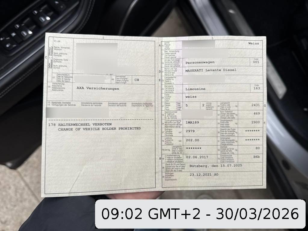 KEYLESS GO, Höhenverstellbare Gurten vorne, Skisack, Fahrprofilauswahl, Steckdose 12V, USB-Anschluss, Türgriffe aussen verchromt, Elektronisch gesteuerte Kühlerjalousie, Tageskilometerzähler, LED Nebelscheinwerfer, Zuheizer, Dämpferregelung, Cupholder hinten, Beide Make up-Spiegel beleuchtet, Heckscheibenheizung, Mittelkonsole mit Ablagefach, Pollenfilter (Staubfilter), 2-Zonen-Klimaautomatik, Allradantrieb permanent, Ablagen in den Türen, Rücksitzlehne geteilt abklappbar, Active Sound (Abgas-Soundsystem), Audiosystem, Partikelfilter und Oxydationskatalysator, Dachhimmel, Veloursfussmatten vorne und hinten, Laderaumabdeckung, Drittes Bremslicht, Innenraumbeleuchtung, LED Heckleuchten, Reifenreparatur-Set, Media: 8 Lautsprecher, Einstiegsschienen, Innenspiegel automatisch abblendbar, Analog-Uhr, Türgriffe aussen beleuchtet für Einstiegsbereich, Airbag: Fahrer und Beifahrer, Fahrlichtautomatik, Wegfahrsperre elektronisch, Airbag: Airbag Beifahrer deaktivierbar, Torque Vectoring, Bluetooth Freisprecheinrichtung, Kopfstützen vorne und hinten mit Logo, Audiofernbedienung am Lenkrad, Aussentemperaturanzeige, Klappdeckel für Ablagefach, Lackierung: Uni-Lackierung, Elektrische Fensterheber vorne und hinten mit Komfortbetätigung und Einklemmschutz, Assist: Bergabfahrassistent, Sonnenblende zweifach, Nebelschlussleuchte, Bordcomputer, Drehzahlmesser, Touchscreen, Wassertemperaturanzeige, Geräusch- und Wärmeschutzverglasung, Applikationen Chrom, Bi-Xenon-Scheinwerfer mit automatischer Höheneinstellung, Keyless Entry, Fussraumbeleuchtung, Digitales Radio (DAB), Elektronisches Stabilitäts-Programm (ESP), Start-/Stop-Knopf, Mittelarmlehne hinten mit USB, Berganfahrassistent, Lenkrad längs- und höhenverstellbar, Fahrersitz elektrisch verstellbar, 3-Punkt-Sicherheitsgurte auf allen Plätzen, TPMS Reifendrucküberwachungssystem, Heckscheiben-Wisch-/Waschanlage, Servolenkung geschwindigkeitsabhängig, Stopp-/Start-System, Mittelarmlehne vorne, mit 2 Getränkehaltern, Beifahrersitz 4fach manuell verstellbar, Leder-Ausstattung, Automatische Heckklappenbetätigung, Antriebsschlupfregelung (ASR), Cupholder, Window-Kopfairbags, Zentralverriegelung mit Fernbedienung, Assist: Elektronische Parkbremse, Heckspoiler, Maserati Touch Control Plus (MTC+), Regen- und Dämmerungssensor, Bremssättel mattgrau lackiert, Applikationen in shiny-black, Kindersicherung im Fahrgastraum, ISOFIX Kindersitzvorrichtung, Fahrer-Informationssystem mit Farbdisplay, Aussenspiegel rechts und links beheizt, elektrisch verstell- / und einklappbar, Gurtstraffer mit Gurtkraftbegrenzer vorne, LED-Tagfahrlicht, 12 Volt-Steckdose im Laderaum, Blinker in Aussenspiegel, Bottleholder in Mittelkonsole, Intelligenter Allradantrieb, Getriebe: 8-Stufen-Automat sequentiell, Laderaumbeleuchtung, Wärmeschutzverglasung, Gepäcknetz(e), Aussenspiegel automatisch abblendend, ABS, EBD elektronische Bremskraft- verteilung, Seitenairbag für Fahrer und Beifahrer, Kartentaschen an den Rückenlehnen, Bremsassistent (BAS), 12-Volt-Steckdose hinten, Leder-Multifunktionslenkrad im 3-Speichen-Design, Tempomat, Beleuchtetes Handschuhfach, Fahrwerk: Adaptive Luftfederung, Ladekantenschutz, Handschuhfach gekühlt