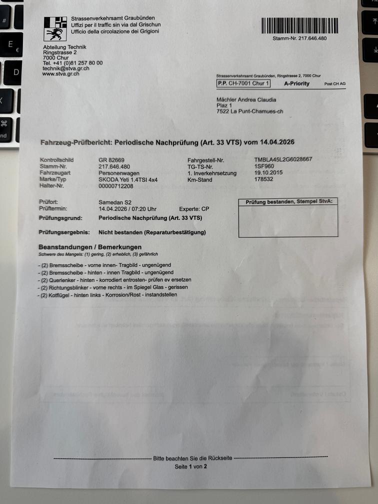 Es wurde kein Werkstatt-Check durchgeführt, da das Fahrzeug die MFK-Prüfung nicht bestanden hat. Anbei finden Sie den Prüfbericht des Strassenverkehrsamtes. Folgende Mängel wurden festgestellt: Die Bremsen vorne und hinten müssen ersetzt werden, der hintere Querlenker ist durchgerostet und muss ausgetauscht werden, das Glas des Blinkers vorne rechts ist zu ersetzen und der Kotflügel hinten links weist Rostschäden auf, die repariert werden müssen. Bezüglich weiterer Gebrauchsspuren an der Karosserie verweise ich auf die Fotos.