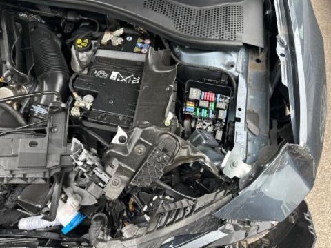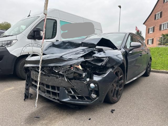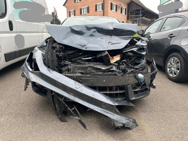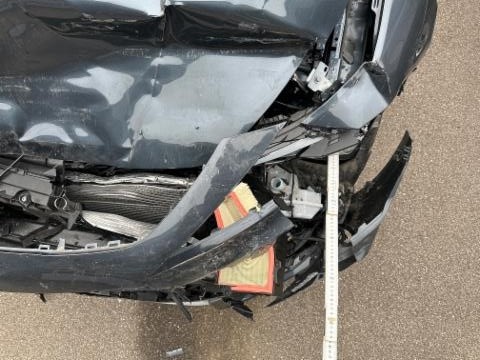Fussgängerschutz ausgelöst. Front eingedrückt. Frontblech/Maskenblech eingedrückt. Radhaus vorne rechts und links eingedrückt. Längsträger vorne rechts und links gestaucht. Fahrzeugvorbau verschoben.