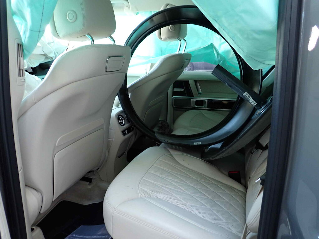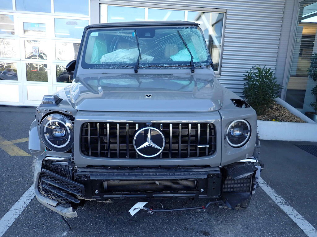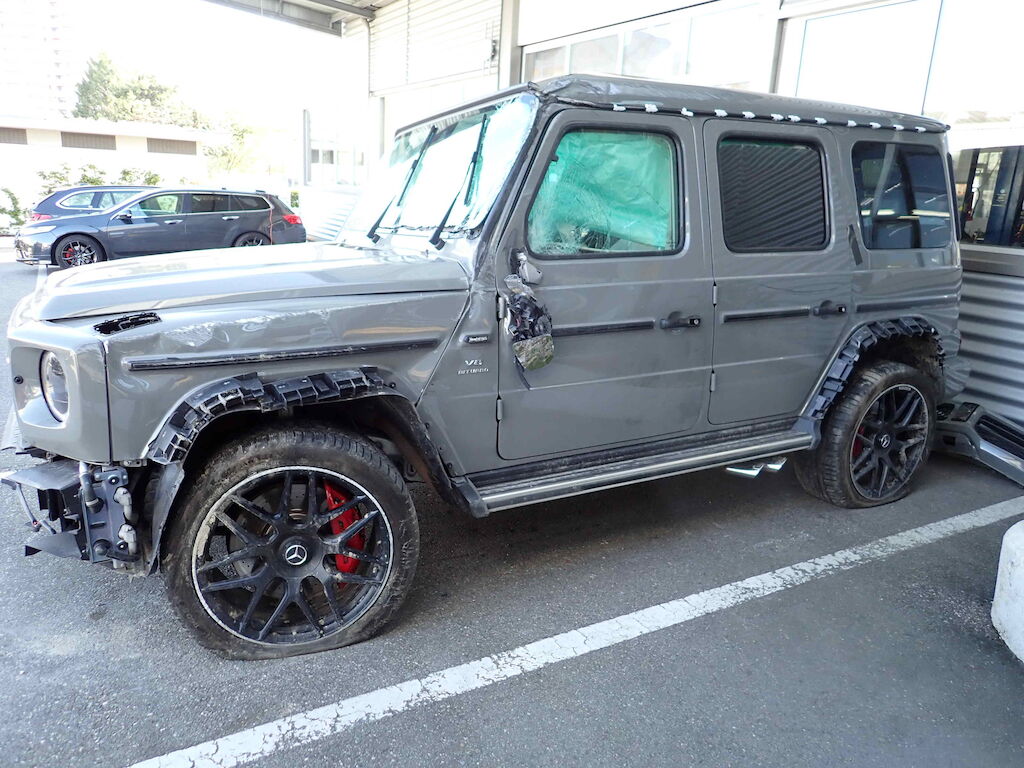 Choc avant + chute sur flanc gauche: pare-chocs, cache et grilles de pare-chocs, traverse, radiateurs, capot moteur, calandre, phares, ailes avec élargisseurs, pare-brise, marche-pied, rétroviseur, caisse cpl avec pavillon, portes, vitres, jantes, berceau et suspension, direction, airbags, ceintures, moteur (bloqué). Motor Getriebe Vorderachse Hinterachse Airbags ausgelöst: 0 unbekannt ( Abfallcode 16.01.04ak )