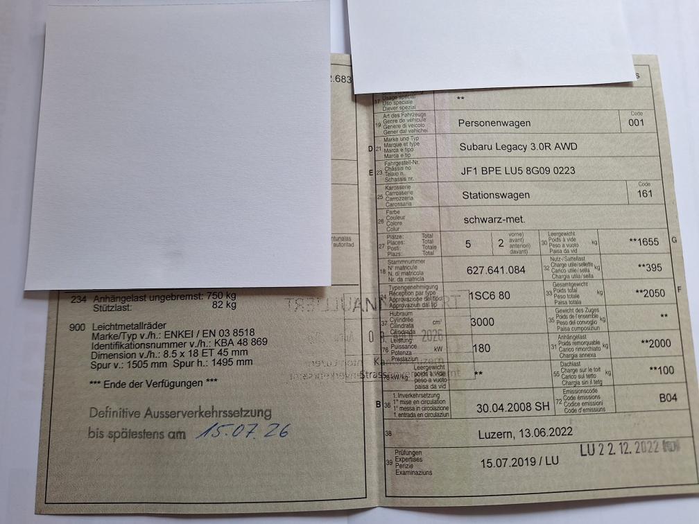 Legacy 3.0R AWD Executive AT, 8-fach Alu, Standheizung & AHK Im Kundenauftrag: Verkaufe Occ. Legacy 3.0R AWD Executive Automatic für Bastler oder Export Mit Standheizung und abnehmbar Anhängerkupplung, 2000kg Anhängelast Mit 18" Sommerräder Enkei, im Ausweis eingetragen (Reifen abgelaufen) 17" Subaru Winterfelgen, Reifen 5-6mm Bekannte Mängel: MFK und Service fällig Fahrersitz angerissen Antriebswellenmanschette vorne rechts defekt Lambdasonde defekt, MKL kommt zeitweise Simmerring Antriebswelle hinten rechts undicht Diverse Anrostungen, Beulen und Kratzer Ab Platz ohne Garantie Beschreibung stammt vom Kunden, wir haben das Fahrzeug nicht auf weitere Mängel geprüft.