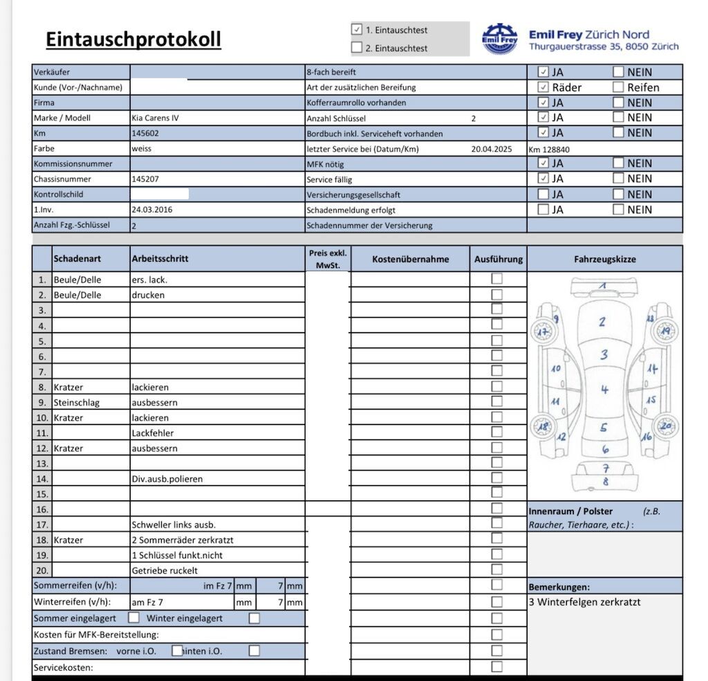 Keine technische Prüfung (Werkstatttest) vorgenommenDiverse Schäden an Karosserie/Lack.Fahrzeug ab Platz, ohne Garantie und Aufbereitung.Keine Gewähr auf die Angaben der Sonder- und Serienausstattung / keine mechanische Prüfung. Fahrzeug wurde unzerlegt expertisiert / keine Haftung für allfällige, nach Demontage bekanntwerdenden Mängel. Fahrzeugbereifung und Ausstattung gemäss Fotos / Fahrzeugkauf auf eigenes Risiko ab Platz ohne Nachwährschaft.- Div. Kratzer und Dellen am gesamten Fahrzeug.- Steinschläge am gesammten Fahrzeug- Fahrerseite hinterer Bereich blättert etwas ab- Getriebe ruckelt- 1 Schlüssel funktionert nicht- Letzter Service bei 128840 Km am 29.04.2025