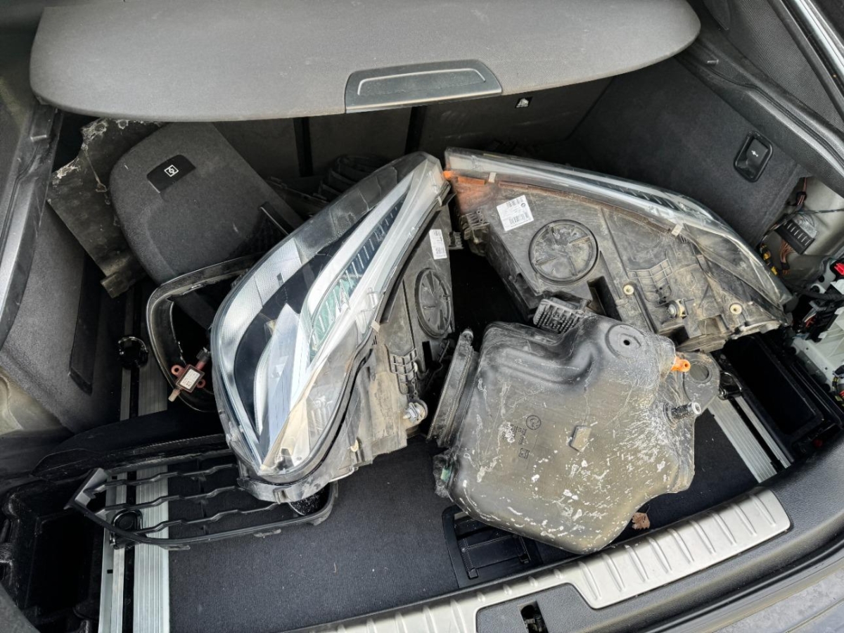 Airbag ausgelöst, Front, Frontscheibe, Gurtstraffer ausgelöst, Klimakühler, Kotflügel links, Kotflügel rechts, Kühler, Kühlgitter, Längsträger vorne links, Längsträger vorne rechts, Motorhaube, Scheinwerfer links, Scheinwerfer rechts, Schlossträger, Stosstange vorne