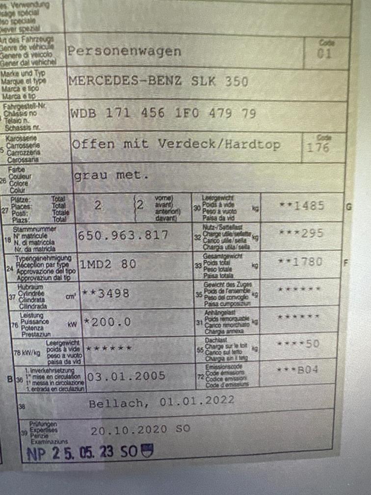 Gepflegter Mercedes SLK Automat mit V6-Motor. Cabrioverdeck funktioniert ohne Mängel. Service wurde im 02/2026 bei Mercedes durchgeführt. Fahrzeug weist altersbedingte Gebrauchsspuren auf. Motor mit Ölverlust Getriebe ebenfalls mit Ölverlust (Dichtungwechsel nötig). Querlenker stark beschädigt (MFK-relevant). Spur muss eingestellt werden. Wir testen und prüfen nicht alle Funktionen des Fahrzeugs. Jede Gewährleistung wird wegbedungen, insbesondere sind Wandlung und Minderung ausgeschlossen.