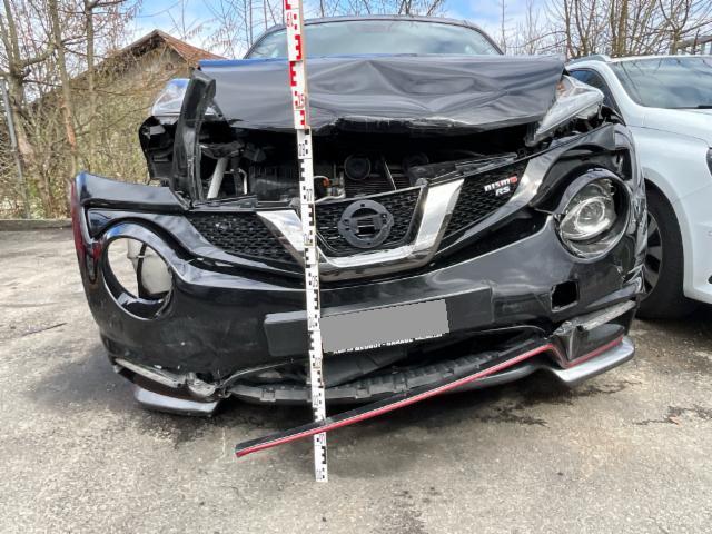 Front eingedrückt. Frontblech/Maskenblech eingedrückt. Radhaus vorne rechts eingedrückt / gestaucht. Fahrzeugvorbau verschoben.