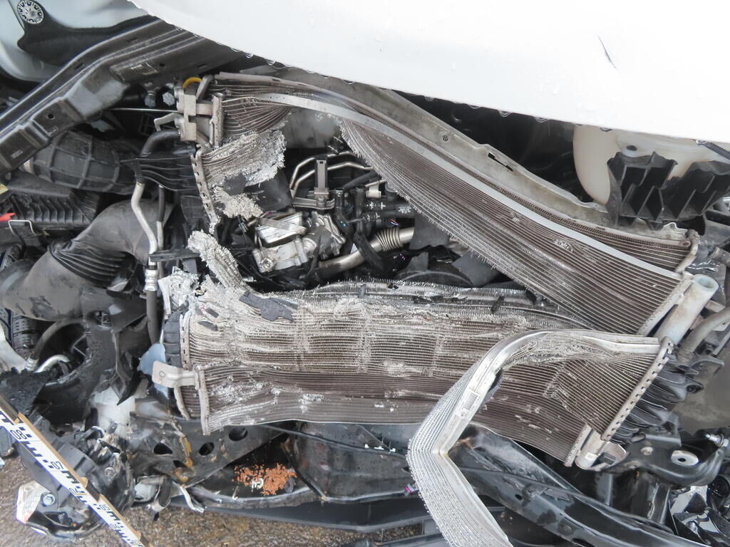 Choc avant: Bloc avant enfoncé et plié. Moteur reculé. (IMPORTANT: RISQUE SUR LE MOTEUR.) Airbags et rétracteur de ceinture déclenchés. Motor Getriebe Vorderachse Hinterachse Airbags ausgelöst: 2 unbekannt ( Abfallcode 16.01.04ak )