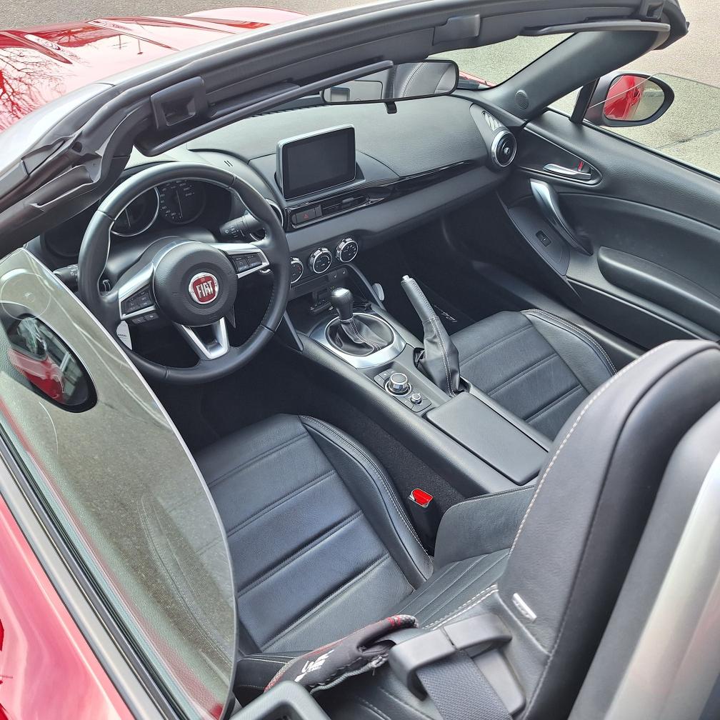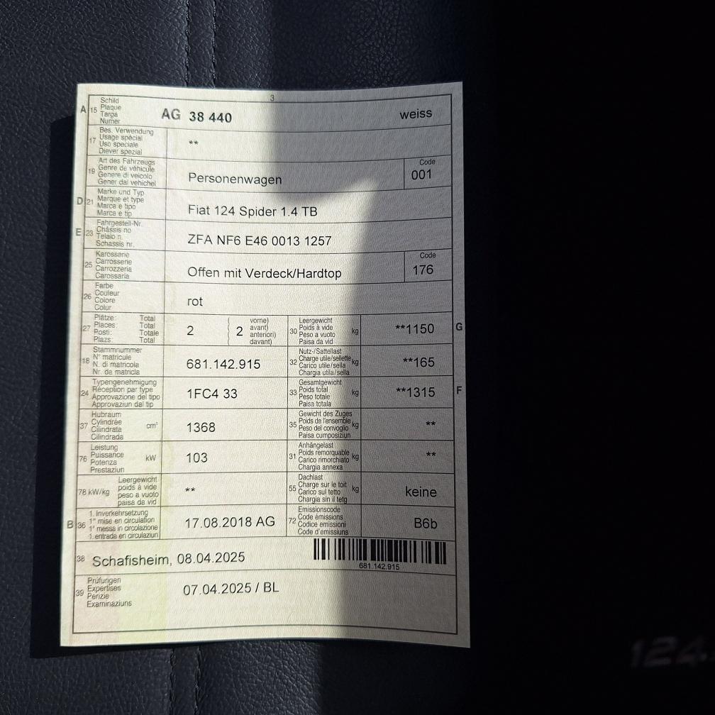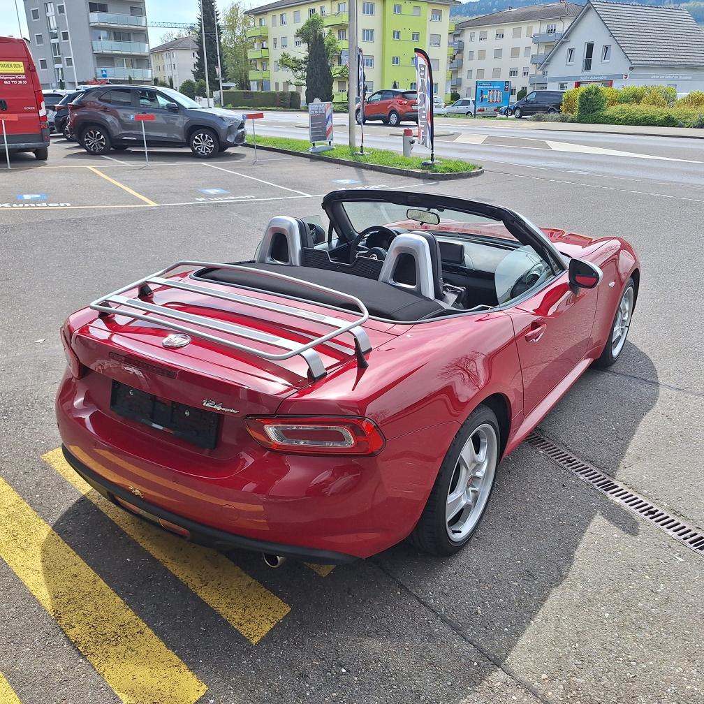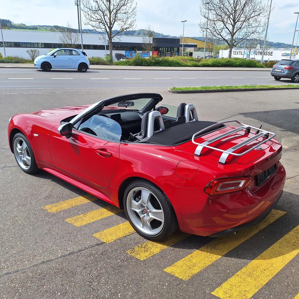 Fiat 124 Spider Europa Limited Edition, Nummer 2 von insgesamt 12 Fahrzeugen in der Schweiz (Serie Anniversary Edition limitiert auf 124 Fahrzeuge weltweit). Das Fahrzeug befindet sich in Topzustand. Interieur: Leder schwarz. Inklusive Mopar-Heckträger und neuem Kofferset (siehe Beispiel-Foto). Nur Sommerbetrieb und sehr gepflegt. Der Fiat Spider erhielt beim Kauf vor einem Jahr einen umfassenden Service inkl. Wechsel Zahnriemen und neue Batterie. Er wurde seitdem nur 4’500 km gefahren. Der Spider ist jetzt frisch ab kleinem Service (Ölwechsel und Wechsel Ölfilter sowie allgemeine Kontrolle). Neue MFK auf Wunsch nach Vereinbarung. Beschreibung / Auszug aus der Pressemitteilung von Stellantis Schweiz: Das Fahrzeug ist eine Hommage an den klassischen Fiat 124 Spider, der vor genau 50 Jahren auf dem Turiner Automobilsalon 1966 präsentiert wurde. Aus Anlass des Marktstarts in der Heimat wurde eine auf exakt 124 Exemplare limitierte Sonderserie des neuen 124 Spider produziert. Die Sonderversion Fiat 124 Spider Anniversary ist an der markanten Karosseriefarbe Passione Rot zu erkennen. Das exklusive Sondermodell Fiat 124 Spider Anniversary basiert auf der Version Lusso, kennzeichnend ist darüber hinaus ein Ausstattungspaket mit adaptiven Hauptscheinwerfern in LED-Technologie sowie Licht- und Regensensor (Visibility Pack). Für aussergewöhnliches Musikvergnügen sorgt eine Audioanlage mit insgesamt neun Lautsprechern - davon vier integriert in die Kopfstützen (Bose Pack). Vervollständigt wird die Ausstattung des Sondermodells durch da schlüssellose Zugangssystem "Keyless Entry", Rückfahrkamera und Navigationssystem mit 3D-Darstellung (Premium Pack). Jedes Exemplar der Sonderserie Fiat 124 Spider Anniversary ist mit einer Seriennummer-Plakette sowie einem speziellen Fiat 124 Spider Logo im Kühlergrill versehen. Gewährleistung oder Garantie, Nachverhandlung und Rücknahme der Ware sind ausgeschlossen.