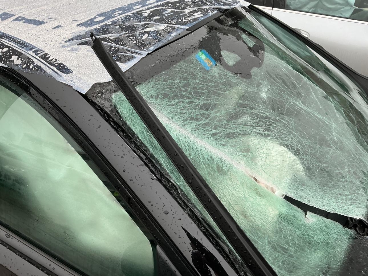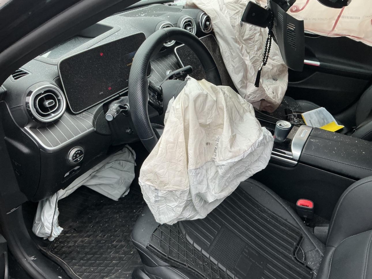 A-Säule, Achsträger, Airbag ausgelöst, Armaturenbrett, Dach, Front, Frontscheibe, Gurtstraffer ausgelöst, Rad hinten rechts