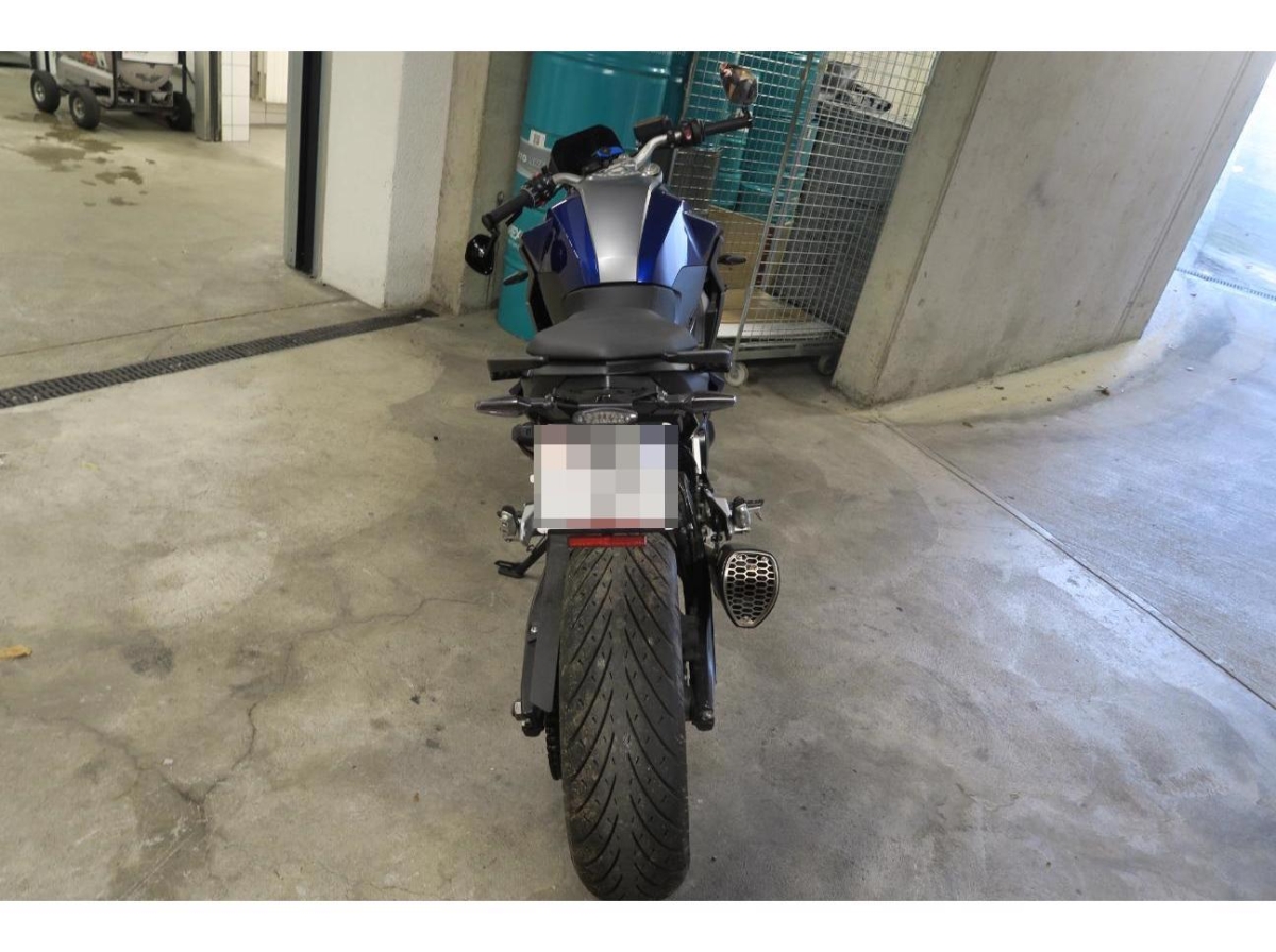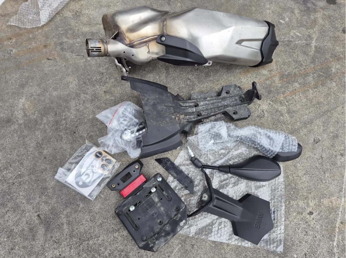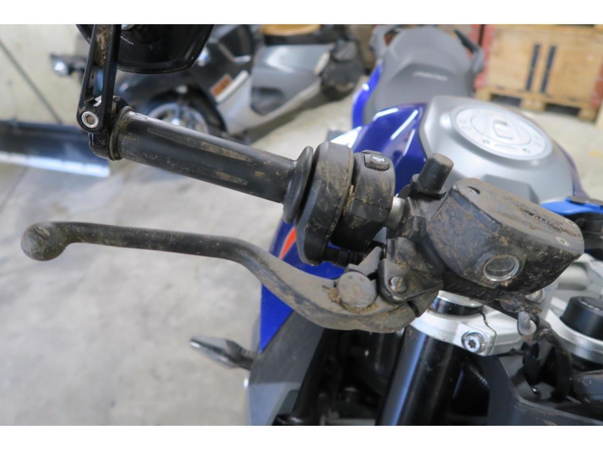 Armaturen, Auspufftopf, Aussenspiegel links, Aussenspiegel rechts, Diverse Anbauteile, Front, Fussraster rechts, Gabelholm, Griff rechts, Heck, Lenkanschlag, Lenker, Rad vorne, Scheinwerfer, Schutzblech vorne, Schwinge, Seite rechts, Verschalungen rechts, Verschalungen vorne, Windschutzscheibe