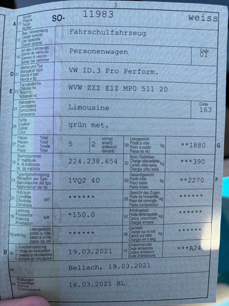Im Kundenauftrag zu verkaufen - ohne Gewähr VW ID.3 Pro Performance - mit Sommerreifen und AHK, Navigation, Rückfahrkamera uvm. Vorbereitung für Fahrschulauto (Pedalanlage Beifahrer ohne Pedale, siehe Foto), muss aber nicht für Fahrschule genutzt werden kleinere Gebrauchsspuren Carrosserie (siehe Fotos) SOS Knopf Aktion von VW - Lieferdatum unbekannt Allgemein sonst gepflegter Zustand. Im Kundenauftrag zu verkaufen, wir übernehmen keine Haftung.