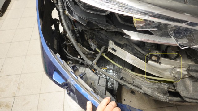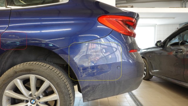 Beschädigung Es sind mehrere Anstossbereiche auszumachen. Anstossbereich vorne links: Stossstangenverkleidung vorne, Frontgrill und Scheinwerfergehäuse rechts gebrochen. Motorhaube eingedellt und beschädigt. Nebelscheinwerfer und unterer Frontgrill gebrochen und beschädigt. Radhausverkleidung vorne und unten rechts gerissen. Querträger oben und Querträger unten verformt und beschädigt. Kotflügel vorne rechts gestaucht. Anstossbereich hinten links Stossstangenverkleidung hinten links angescheuert und Lackoberfläche beschädigt. Lackoberfläche der Seitenwand beschädigt.