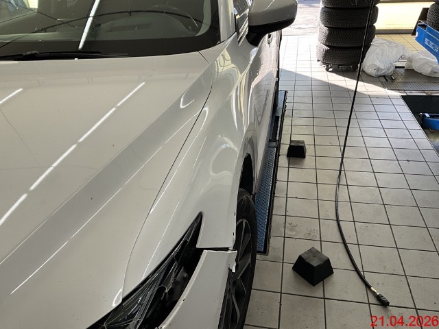 Seitenschaden vorne links. Stossfängerverkleidung, Motorhaube verschoben (Fanghaken steht schief), Kotflügel, Radlaufleiste, Scheinwerfer, Aufhängung deformiert, Felge beschädigt. Spaltmasse an der Front weichen ab, Risiko Längsträger. Fahrzeug wurde zur Schadenermittlung nicht zerlegt, Aufzählung NICHT abschliessend. / Vorbestandene Schäden: Seite links: Einstieg Fahrer div. Dellen und Kratzer. Dem Alter und der Laufleistung entsprechende Gebrauchsspuren und Kratzer. Hundefahrzeug.