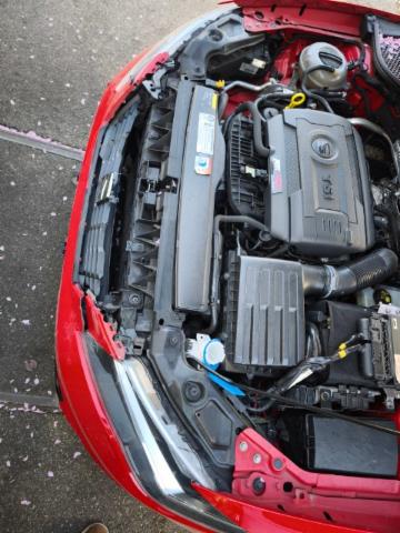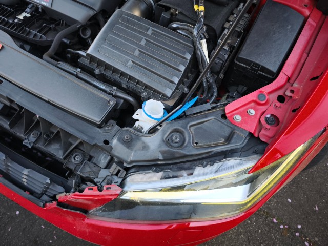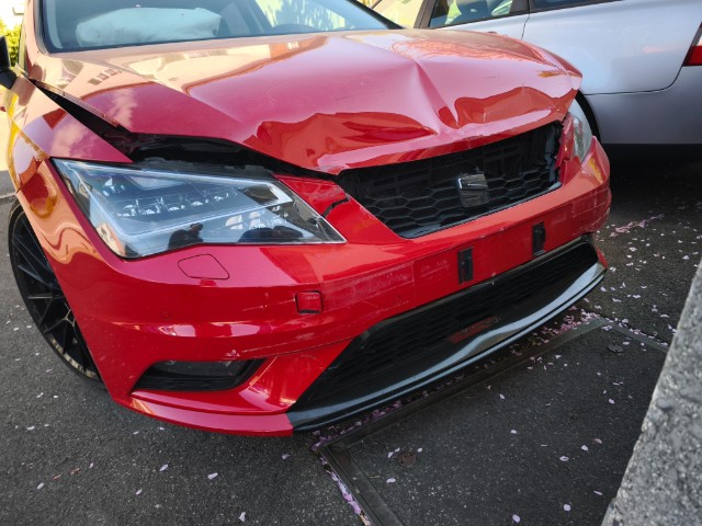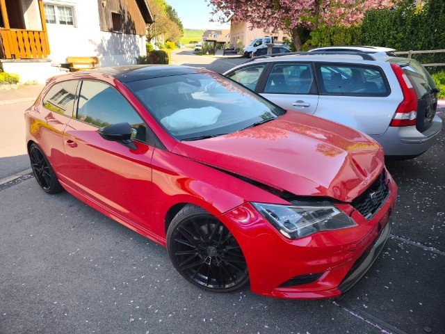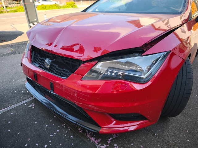 Die Front und alle Anbauteile der Front sind beschädigt worden. Motor läuft, aber unrund. Ursache unklar. Weiter beschädigt sind die A-Säule links und rechts. Zudem sind der Fahrer,- Knie, - und Beifahrerairbag sowie die Gurtstraffer vorne ausgelöst.